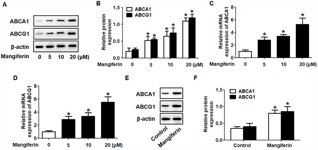 ABCA1 and ABCG1 are two key players in cholesterol efflux from foam cells and the in vivo RCT pathway [22]. To determine the underlying mechanisms by which mangiferin promotes cholesterol efflux and RCT, we investigated the effect of mangiferin on the expression of ABCA1/G1. RAW264.7 macrophage-derived foam cells were treated with various concentrations of mangiferin (0, 5, 10, and 20 μM) for 24 h and then harvested for western blot and RT-qPCR analyses. The results showed that mangiferin potently enhanced the protein and mRNA levels of ABCA1/G1 in a concentration- dependent manner (Figure 3A–3D). In addition, the protein levels of ABCA1/G1 were increased in the aortic roots of mangiferin-injected mice compared with those of the control mice (Figure 3E, 3F). Moreover, mangiferin treatment did not significantly influence the degradation and phosphorylation of ABCA1/G1 protein (Supplementary Figure 3). Therefore, the stimulating effects of mangiferin on macrophage cholesterol efflux and in vivo RCT are likely achieved by amplification of ABCA1/G1 expression.