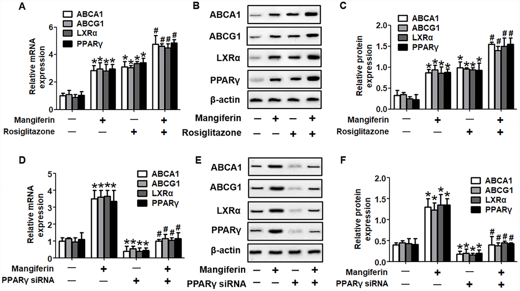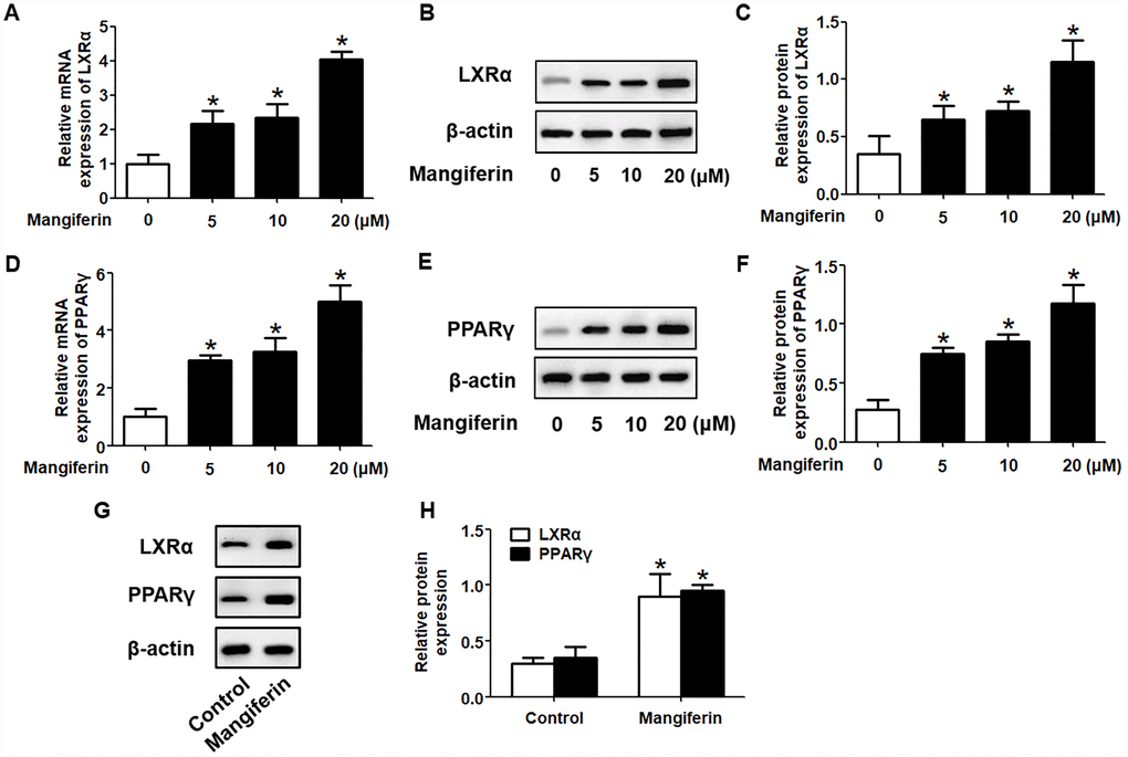 Taken together, for the first time, our study provides new insights for mangiferin-mediated athero-protection by stimulating macrophage cholesterol efflux and alleviating lipid deposition via induction of the PPARγ-LXRα-ABCA1/G1 pathway. These findings may provide a novel angle from which to examine the therapeutic effects of mangiferin in preventing AS.