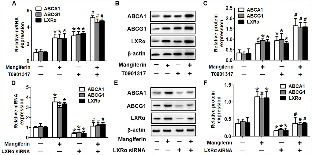 LXRα, identified as a transcriptional activator, plays a key role in modulating glycolipid metabolism and maintaining cholesterol homeostasis [32]. Research has shown that ABCA1 and ABCG1 are the target genes of LXRα and that LXRα activation directly enhances ABCA1/G1 expression [33, 34]. Zeng et al. [35] observed that dihydromyricetin (DMY), a bioactive flavonoid component abundant in the leaves of Ampelopsis grossedentata, upregulates NBD-cholesterol efflux to apoA-1 or HDL and attenuates oxidized (ox)-LDL-induced lipid deposition in human THP-1-derived macrophages via activation of the LXRα-ABCA1/ABCG1 pathway, which further increased serum HDL-C levels and inhibited atherosclerotic plaque formation. Similarly, Jin et al. [36] reported that homocysteine (Hcy), a nonessential amino acid, exacerbated aortic lesion development and intraplaque lipid accumulation in apoE-/- mice by decreasing cholesterol efflux from THP-1 macrophage-derived foam cells through inhibition of the LXRα-ABCA1/ABCG1 signaling pathway. Furthermore, treatment of mice with LXRα agonist significantly compensated for Hcy-induced lesion area and lipid accumulation in aortic plaques of apoE-/- mice, thus weakening the atherogenic effects exerted by Hcy. 9-cis-retinoic acid (9-cis-RA) can increase serum HDL-C concentrations and reduce atherosclerotic lesion areas in vivo. Treatment of J774A.1 macrophages with 9-cis-RA significantly enhanced the expression of ABCA1/G1 and LXRα, cholesterol efflux, and alleviated lipid accumulation, effects that were suppressed by LXRα knockdown [37]. In the current study, we observed that macrophage LXRα expression levels were dramatically increased by mangiferin treatment in a concentration-dependent manner and that incubation with LXRα siRNA abrogated mangiferin-stimulated ABCA1/G1 expression, as well as intracellular cholesterol efflux. Furthermore, LXRα protein levels were also increased in aortic roots of mangiferin-injected apoE-/- mice compared to those of the control group. These outcomes indicated that LXRα is implicated in mangiferin-induced cholesterol unloading and athero-protection.