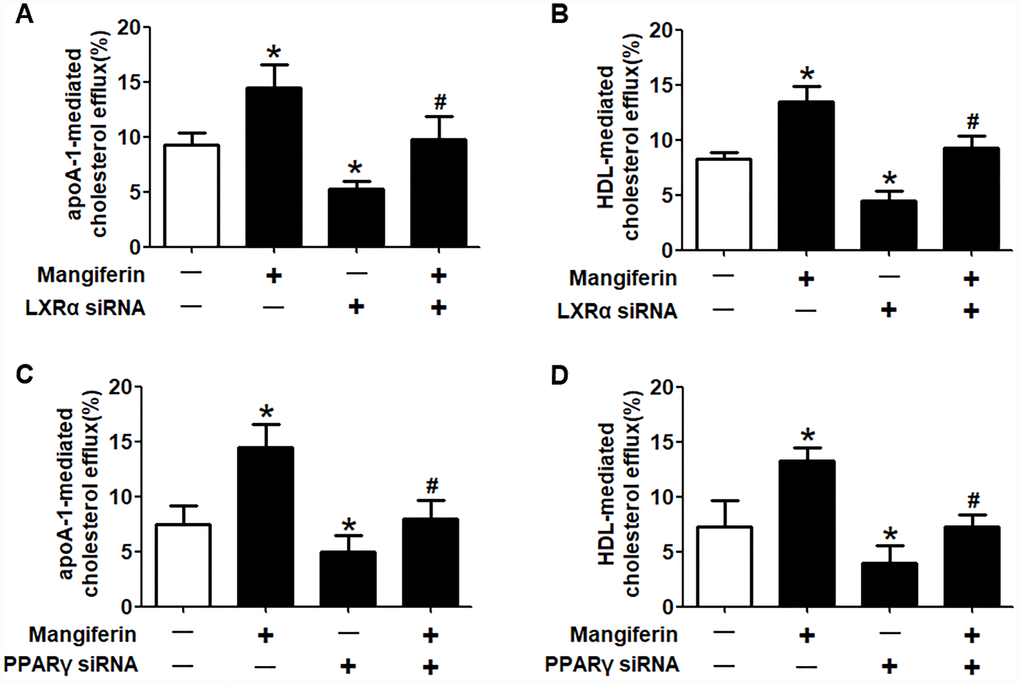 It is well known that the PPARγ/LXRα pathway is critical in modulating macrophage ABCA1/G1 expression and lipid homeostasis [23]. We next examined whether the PPARγ/LXRα pathway is implicated in the positive effects of mangiferin on ABCA1/G1 expression and cholesterol efflux. As shown in Figure 4A–4F, treatment of RAW264.7 macrophage-derived foam cells with mangiferin markedly elevated the mRNA and protein expression of LXRα and PPARγ in a dose-dependent manner. Similarly, in the aortic roots of mangiferin-injected mice, the protein levels of LXRα and PPARγ were also increased compared with those of the control group (Figure 4G, 4H), indicating that mangiferin elevates LXRα and PPARγ expression both in vitro and in vivo. Additionally, treatment of foam cells with the LXRα agonist T0901317 significantly magnified mangiferin-induced ABCA1/G1 mRNA and protein expression (Figure 5A–5C). In contrast, transfection of LXRα siRNA abolished the positive effects of mangiferin on the expression of ABCA1/G1 (Figure 5D–5F), demonstrating that LXRα mediates the stimulatory effect of mangiferin on ABCA1/G1 expression. Next, we further confirmed whether PPARγ is involved in the effects exerted by mangiferin. As shown in Figure 6A–6C, incubation with rosiglitazone, a selective PPARγ agonist, notably amplified the mangiferin-induced mRNA and protein levels of ABCA1/G1 and LXRα. The opposite effects were observed after transfection with PPARγ siRNA (Figure 6D–6F), indicating that mangiferin promotes ABCA1/G1 expression via activation of the PPARγ/LXRα pathway. Furthermore, transfection of LXRα siRNA or PPARγ siRNA also substantially compensated for mangiferin-induced cellular cholesterol efflux from foam cells to apoA-1 or HDL (Figure 7). Taken together, these results suggest that mangiferin exerts its positive effects on ABCA1/G1 expression and cholesterol efflux, at least in part, via activation of the PPARγ/LXRα pathway in RAW264.7 macrophage-derived foam cells.