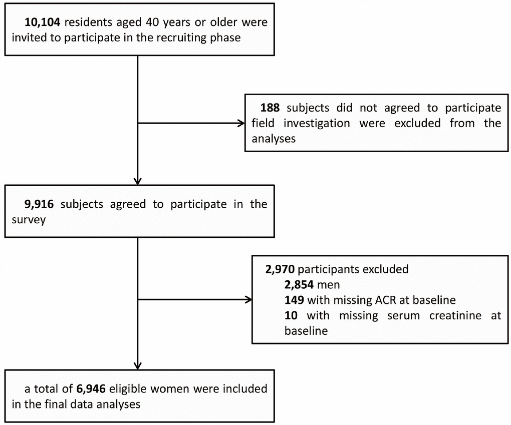 We performed the present retrospective study in one of the centers from June to November, 2011 for the community located in Guangzhou, China. During the recruiting phase, a total of 10,104 residents aged 40 years or older were invited to participate by examination notices or home visits. In total, 9,916 subjects agreed to participate in the survey, and the participation rate was 98.1%. In data analyses, men (n = 2,854) were first excluded from the study. Subjects who failed to provide information (urinary albumin-to-creatinine ratio [ACR]: n = 149; serum creatinine: n = 10) were then excluded from the analyses. Accordingly, a total of 6,946 eligible women were included in the final data analyses. The details of the selection of study participants are presented in a flow diagram (Figure 3).