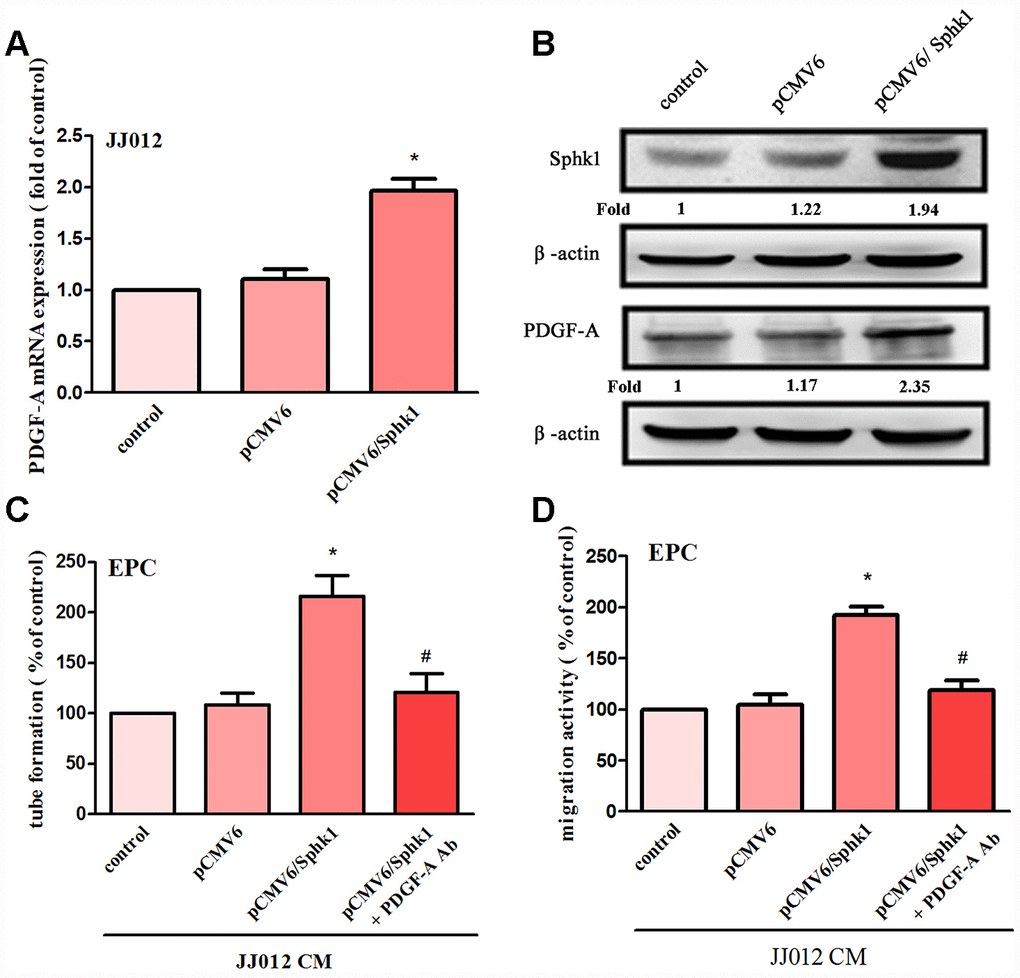 The application of S1P to chondrosarcoma cell lines JJ012 and SW1353 concentration-dependently augmented PDGF-A mRNA and protein expression (Figure 1A, 1B). Evaluation of S1P-regulated angiogenesis in chondrosarcoma cells by EPC migration and tube formation assays [27] revealed that conditioned medium (CM) from S1P-treated chondrosarcoma cells stimulated EPC migration and tube formation (Figure 1C, 1D), whereas PDGF-A monoclonal antibody (mAb) treatment suppressed these events (Figure 1C, 1D). To confirm the role of S1P in EPC angiogenesis, the cells were transfected with SphK1 cDNA. We observed that overexpression of SphK1 cDNA increased levels of SphK1 protein expression (Figure 2B). Overexpression of SphK1 also increased PDGF-A mRNA and protein expression, EPC migration and tube formation (Figure 2). In addition, the PDGF-A mAb also blocked SphK1 facilitated EPC migration and tube formation (Figure 2C, 2D). Thus, S1P appears to stimulate EPC angiogenesis in a PDGF-A-dependent manner.