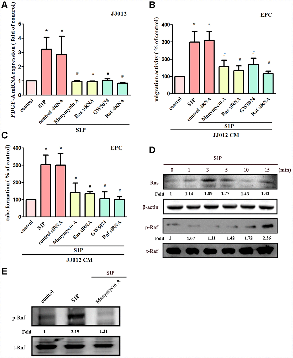 The Ras/Raf/MEK/ERK signaling pathway regulates tumor angiogenesis and metastasis [28, 29]. Treatment of cells with manumycin A (a Ras inhibitor) or GW5074 (a Raf inhibitor) suppressed S1P-enhanced PDGF-A expression, EPC migration and tube formation (Figure 3A–3C). Next, Ras and Raf siRNAs were used to confirm the results obtained from pharmacological inhibitors. We found that Ras and Raf siRNAs abolished S1P-mediated effects (Figure 3A–3C). Incubation of chondrosarcoma cells with S1P enhanced Ras kinase activity and Raf phosphorylation (Figure 3D). The Ras inhibitor also reduced S1P-enhanced phosphorylation of Raf (Figure 3E), indicating that Ras serves as an upstream molecule of Raf.