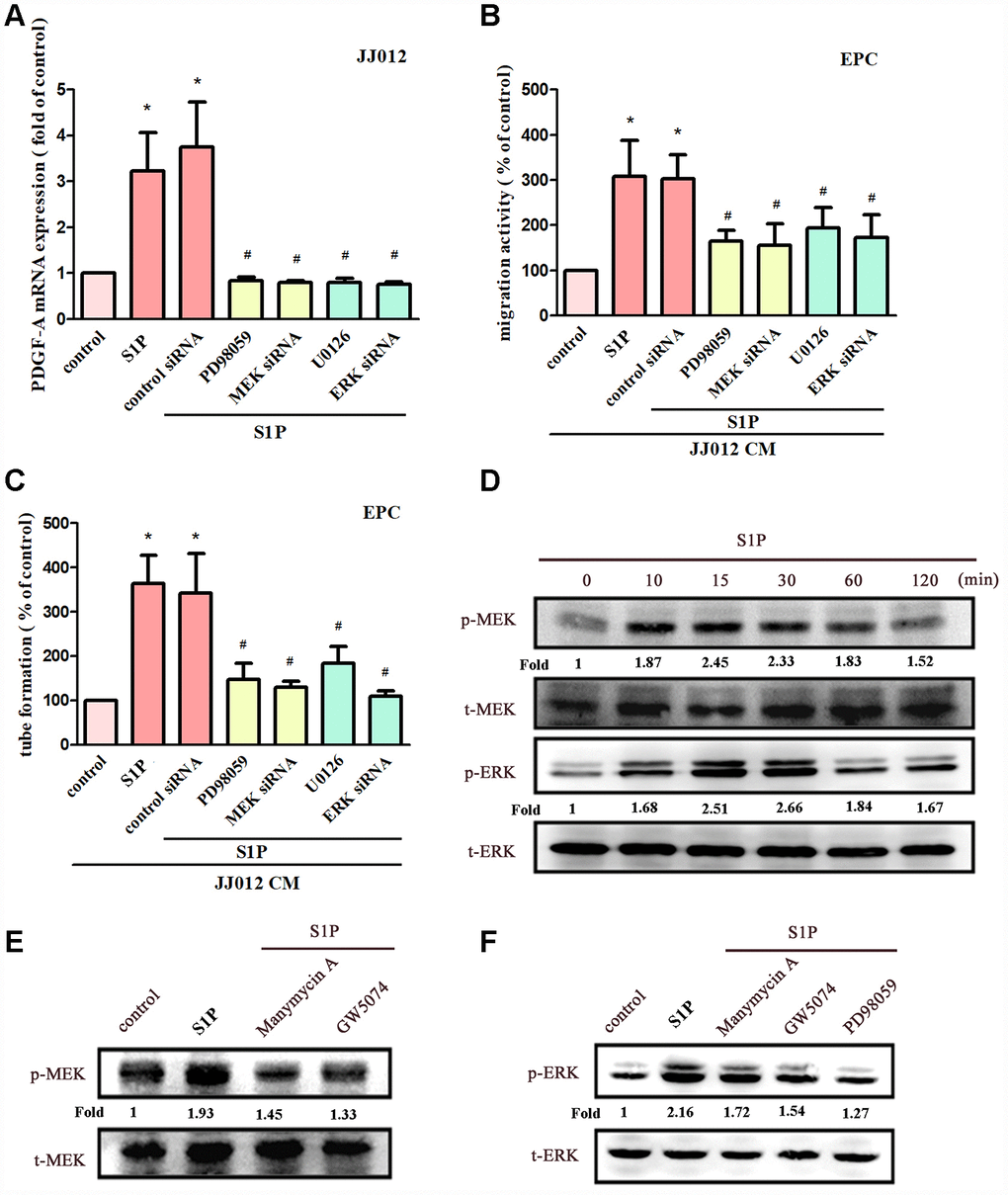 The activation of the Ras/Raf/MEK/ERK signaling pathway is essential in many types of cancer for mediating multiple cellular functions, including cell survival, proliferation, migration and autophagy [29]. The Ras/Raf/MEK/ERK signaling pathway is also associated with tumor angiogenesis, as is seen with toluhydroquinone (2-methyl-1,4-hydroquinone), a marine-derived fungi, which reduces HUVEC angiogenesis via the Ras/Raf/MEK/ERK cascade [39]. In this study, we observed that S1P enhanced Ras, Raf, MEK and ERK activation, while Ras, Raf, MEK and ERK inhibitors and their siRNAs inhibit S1P-induced PDGF-A expression. It appears that the Ras/Raf/MEK/ERK signaling pathway is involved in S1P-mediated PDGF-A expression and angiogenesis. AP-1 has been indicated controls PDGF expression [31]. In current study, we also confirm AP-1 inhibitor or c-Jun siRNA abolished S1P-promoted PDGF-A expression. Otherwise, KLF5 has been previously shown to regulate PDGF-A expression through HIF1α [40]. Whether HIF1α also involve S1P-controled PDGF-A production are needs further examination.