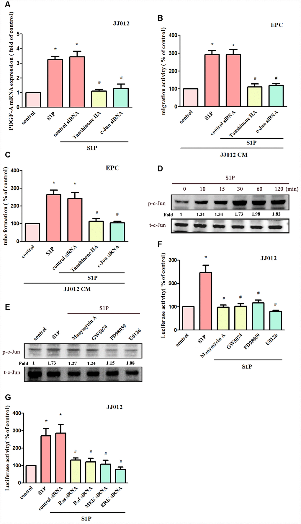 AP-1 appears to regulate PDGF gene expression [31]. We therefore examined whether AP-1 influences S1P-mediated PDGF-A expression in chondrosarcoma cells. Transfecting cells with an AP-1 inhibitor (tanshinone IIA) or c-Jun siRNA reduced S1P-promoted PDGF-A expression (Figure 5A); these compounds also suppressed S1P-induced EPC migration and tube formation (Figure 5B, 5C). S1P significantly promoted c-Jun phosphorylation (Figure 5D), which was reduced by pretreatment with Ras, Raf and MEK inhibitors (Figure 5E). To confirm that the Ras/Raf-1/MEK1/ERK signaling pathway mediated S1P-enhanced activation of AP-1, the AP-1 luciferase promoter plasmid was used. Treatment of cells with S1P augmented AP-1 luciferase activity, while pretreating the cells with Ras, Raf, MEK and ERK inhibitors or their siRNAs reduced S1P-induced AP-1 luciferase activity (Figure 5F, 5G). Activation of Ras, Raf-1, MEK1 and ERK appears to be involved in S1P-induced AP-1 activation in human chondrosarcoma cells.