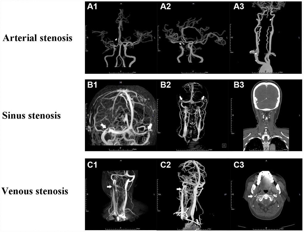 CAS typically presents with focal neurological deficits, while CVS displays non-specific symptoms such as intracranial hypertension and venous outflow turbulence induced disturbance related symptoms. Symptoms in CAVS were complex, which could comprise CAS and CVS related clinical manifestations. Both cerebral arterial and venous stenosis can result in CCCI. Aged patients might have CAS and CVS concomitantly. Venous imaging should also be conducted in these patients even though the diagnosis of arterial stenosis is present. Considering limitations of this study, further epidemic investigations with large sample size are needed in the future.