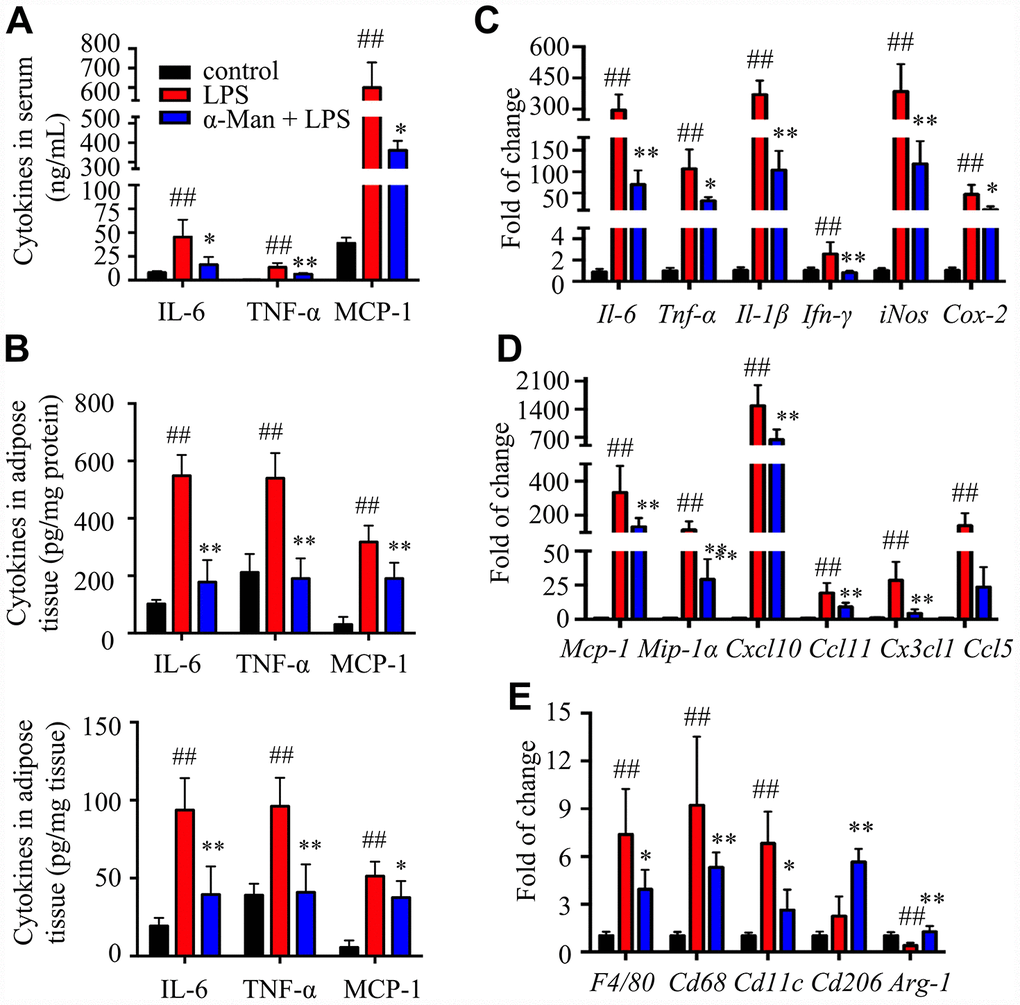 Lipopolysaccharide (LPS) is a component of the outer envelope of all gram-negative bacteria, which is widely used to induce pro-inflammatory responses in adipose tissue [17]. To determine the effect of α-Man in improving adipose tissue inflammation, LPS induced acute inflammation mice model was implemented (Supplementary Figure 1B). Pre-treatment of α-Man (10 mg/kg/d) for 5 days didn’t affect the body weight of mice (Supplementary Figure 1C). Four hours after LPS injection, the pro-inflammatory cytokine levels, including interleukin-6 (IL-6), tumor necrosis factor-α (TNF-α) and monocyte chemoattractant protein-1 (MCP-1), were increased in serum from LPS-treated mice, compared with those from the vehicle control mice; whereas these inflammatory cytokine levels were significantly reduced in serum from α-Man pre-treated mice (Figure 1A). White adipose tissue (WAT) is distributed throughout the body; each depot has specific characteristics. The inflammation in epididymal WAT (eWAT) promotes insulin resistance and metabolic disorders [18]. Thus, we further evaluated the inflammatory responses in eWAT. Consistently, α-Man reversed LPS-induced increases of cytokines in eWAT, assessed by ELISA kits (Figure 1B) and qRT-PCR (Figure 1C). These results were in agreement with the effects of α-Man on LPS-induced RAW264.7 macrophages in vitro (Supplementary Figure 2A–2D).