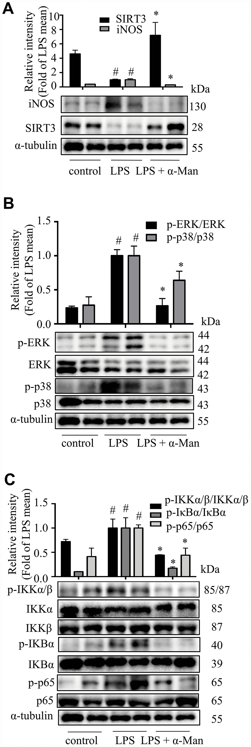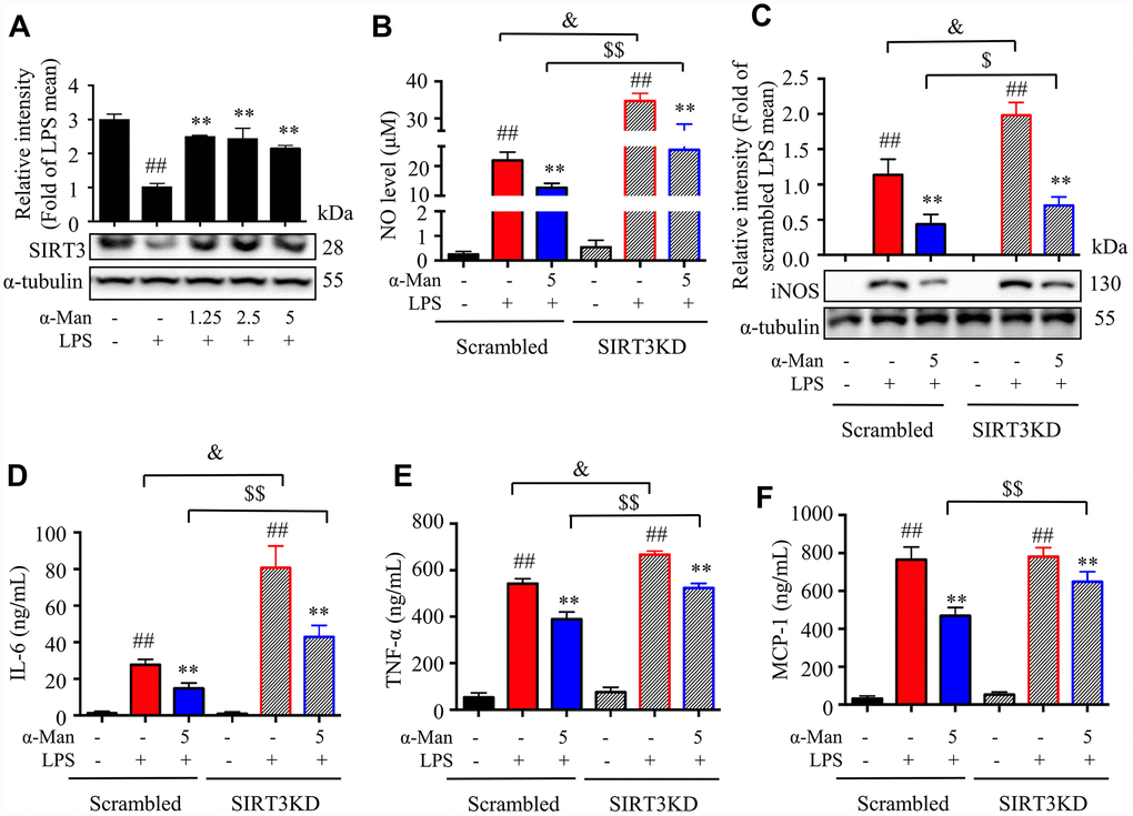 LPS induces the expression of iNOS (inducible nitric oxide synthase), which mediating the production of nitric oxide (NO), a key inflammatory mediator [20]. Nuclear factor-κB (NF-κB), a nuclear transcription factor, is a regulator of inflammatory processes, which is required for the transcription of numerous cytokines, including TNF-α, IL-1β, and IL-6 [21]. Mitogen-activated protein kinases (MAPKs), including p38 MAPK, extracellular regulated kinase (ERK), and c-Jun NH2-terminal kinase (JNK), are important players in signal transduction of inflammation [22]. The deacetylase Sirtuin 3 (SIRT3) has been reported to activate the MAPKs and NF-κB signaling pathways in an inflammatory model [23]. As shown in Figure 2A, the iNOS expression was increased and SIRT3 expression was decreased in eWAT from LPS-treated mice, and α-Man treatment significantly reversed these changes. The above results were consistent with the effects of α-Man on LPS-induced RAW264.7 macrophages (Supplementary Figure 3A). Moreover, α-Man significantly suppressed the LPS-induced activation of MAPKs and NF-κB pathways in eWAT (Figure 2B, 2C), which were in agreement with the effects of α-Man on LPS-induced RAW264.7 macrophages (Supplementary Figure 3B–3D). Treatment with α-Man abolished the LPS induced IKK activation in macrophages (Supplementary Figure 3E). Furthermore, SIRT3 knockdown partially blocked the anti-inflammatory property of α-Man on RAW264.7 macrophages (Figure 3A–3F). These data demonstrated that α-Man alleviates LPS-induced acute adipose tissue inflammation through inhibiting NF-κB and MAPKs activation and promoting SIRT3 expression.