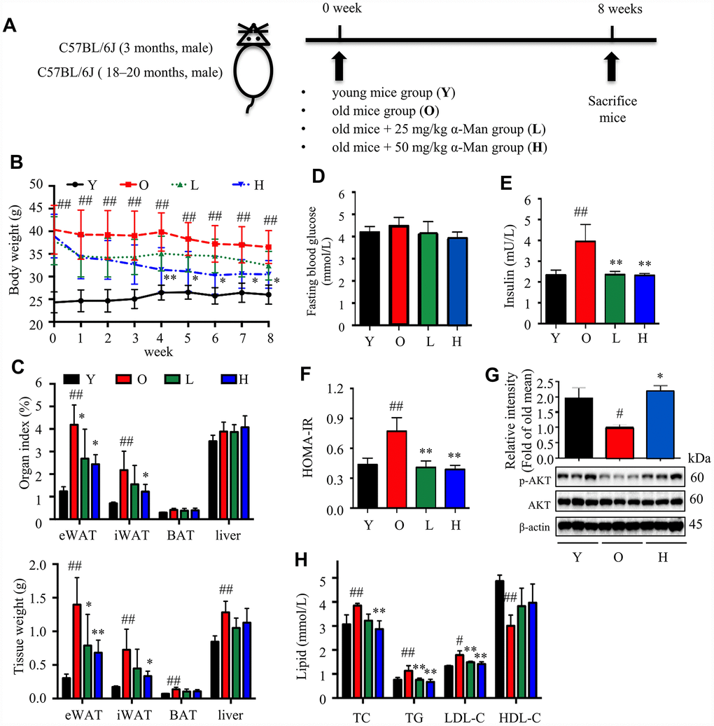 {Che, 2014 #783}A cohort of young (3 months old) and old (18–20 months old) C57BL/6J male mice were recruited. The old mice were randomly divided into three groups according to body weight (n = 5 in each group). The mice in α-Man-25 (low dosage, L) and α-Man-50 (high dosage, H) groups were orally administrated with 25 and 50 mg/kg/d of α-Man (dissolved in PEG 400 solution) once a day for 8 weeks, respectively; and the old (O) and young (Y) control group of mice were orally administrated with the same volume of vehicle solution (10 mL/kg, PEG 400:distilled water = 6:4, v/v). At the end of experiment, the blood samples were collected from mice under inhalational anesthesia with isoflurane. The mice were euthanatized by carbon dioxide, and the eWAT, iWAT, BAT and liver were dissected. One part of eWAT was quickly rinsed in Krebs-Ringer bicarbonate (KRB) buffer for isolation of SVF, another part was fixed in 4% paraformaldehyde for histochemical and immunohistochemical analyses, and the remaining eWATs were stored at -80 °C for subsequent Western blotting and qRT-PCR analyses.