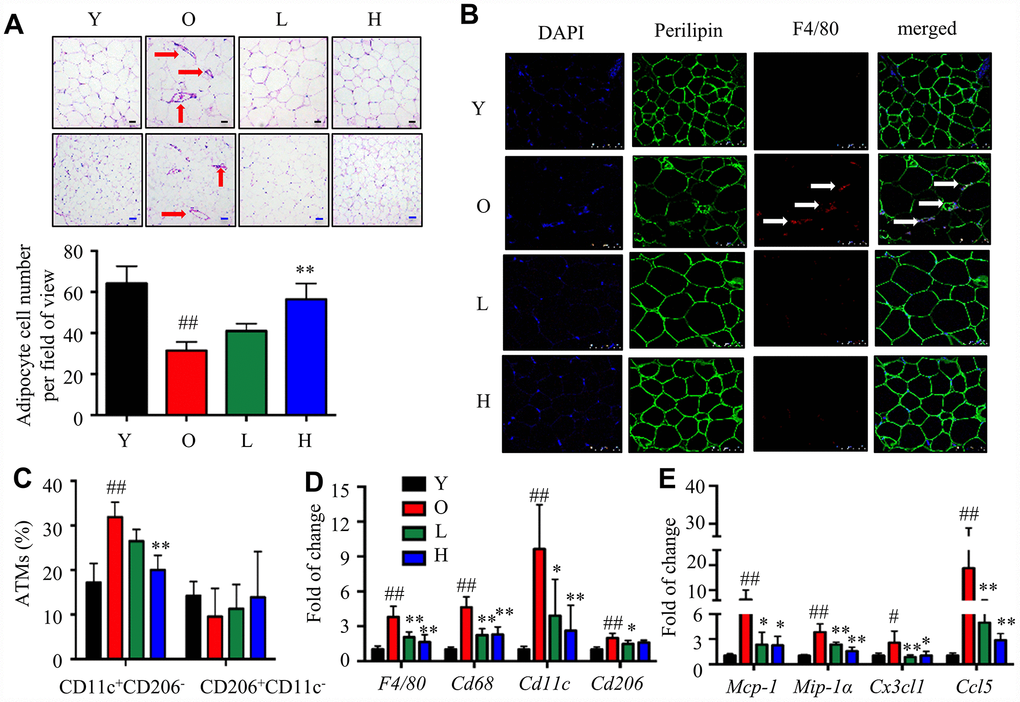 Aging is associated with adiposity, ectopic fat distribution, and chronic low-grade adipose tissue inflammation, which result in the onset and development of insulin resistance and related metabolic disorders [2]. Adipose tissue dysfunction results in dysregulated release of fatty acids and secretion of adipose tissue-derived hormones and microRNAs (miRNAs), which in turn influence other organs, such as liver and skeletal muscle [3]. Based on several large epidemiologic studies of older adults, the ‘inflamm-aging’ theory considers chronic inflammation as the common pathological basis for aging and aging-related metabolic diseases [4, 5]. Adipose tissue has been considered as the major contributor to the chronic, low-grade inflammation during aging [3]. Adipose tissue comprises of mature adipocytes and stromal vascular fraction (SVF), the latter mainly comprises of macrophages [6]. Accumulating evidence suggests that adipose tissue macrophages (ATMs) are a major pathogenic factor of aging and aging-related metabolic diseases [7, 8]. Classically activated macrophages (M1) contribute as the main source of pro-inflammatory cytokines, and are positively associated with obesity and insulin resistance; while alternatively activated macrophages (M2) secrete anti-inflammatory cytokines, and are associated with insulin sensitivity and lean phenotype [7, 9]. The profile of ATMs shifts towards a pro-inflammatory state in aged adipose tissue, as reflected by an increase of the ratio of M1/M2 macrophages [8]. Therefore, interventions preventing the infiltration and pro-inflammatory polarization of ATMs might be promising ways to treat aging-related metabolic disorders.