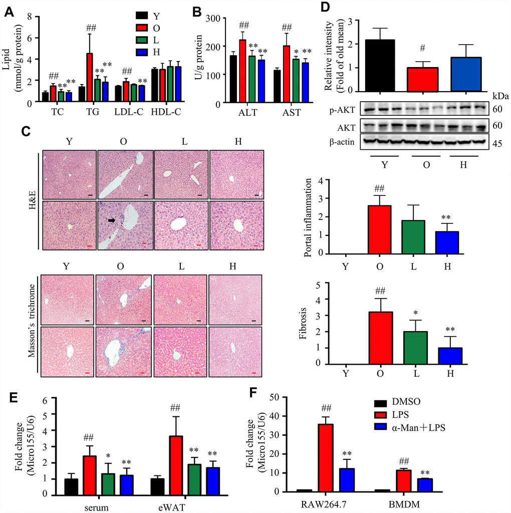 miRNAs are small non-coding RNAs that modulate the target genes expression involved in diverse biological processes. miRNAs could be a link among inflamm-aging, obesity and diabetes [49–51]. miR-155 is a common target of a broad range of inflammatory mediators, and is induced during inflammatory response in macrophages [28]. α-Man was found to suppress the level of miR-155 in LPS-induced RAW274.7 macrophages and BMDMs. ATMs in obese subjects secret miR-155-containing exosomes, which causes glucose intolerance and insulin resistance in adipocytes, myocytes, and primary hepatocytes [52]. TNF-α increases miR-155 expression in adipocytes, which results in obesity progression in female mice by limiting BAT differentiation [53]. Silencing miR-155 causes depression of CCAAT/enhancer binding protein β and down-regulation of granulocyte colony-stimulating factor in LPS-treated mice [54], and attenuates liver steatohepatitis and fibrosis in alcohol-induced mice [29]. miR-155 is increased in serum/plasma in alcoholic and inflammatory liver injury [55]. miR-155 targets NF-κB and MAPKs pathway, which are the inflammatory response crossroad among macrophage, adipocyte and aging [56, 57]. α-Man decreased miR-155 expression in serum and eWAT from old mice, which might benefit the improvement of liver injury in α-Man-treated old mice. It will be interested to further explore the effects of miR-155 on the dynamics of intracellular cAMP production, as it has previously been linked to granular priming and exocytosis. Thus, the protective effect of α-Man against liver injury in old mice might be associated with the suppression of both pro-inflammatory cytokines and miR-155.