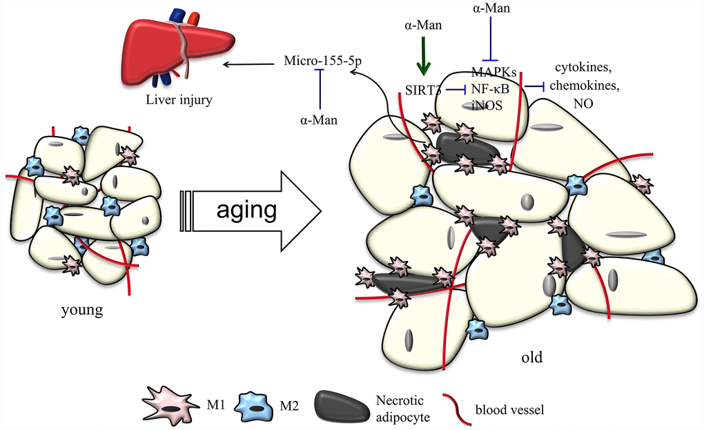 Natural products are important source of therapeutic agents to ameliorate inflammatory responses in adipose tissue and treat aging-related metabolic disorders. Dietary curcumin supplementation reduces macrophage infiltration and increases the ratio of M2/M1 macrophages in WAT from HFD-fed mice [32]. Corosolic acid, called “phyto-insulin”, was reported to improve adipose tissue inflammation and insulin resistance in HFD-fed mice [33]. Resveratrol, a sirtuin1 (SIRT1) activator, inhibits NF-κB activation and improves insulin sensitivity in eWAT from high-fat, high-sugar fed rhesus monkeys [34]. 1,3,6,7-Tetrahydroxy-8-prenylxanthone was found to alleviate adipose tissue inflammation through modulating macrophage phenotype and chemotaxis in eWAT from LPS-treated mice [17]. α-Man has been widely reported with anti-obesity and anti-inflammatory properties [15, 16, 35, 36]. α-Man inhibits p65 acetylation and reduces COX-2 and iNOS gene expression via activating SIRT1 in LPS-treated human monocytes [35]. α-Man suppresses adipocyte differentiation and reduces adiposity in HFD fed mice [15, 16]. The current study provided the first evidence that α-Man reverses inflammatory responses in adipose tissue from LPS-treated or aging mice, which uncovers the beneficial effects of α-Man on aging-related hyperlipidemia, insulin resistance and liver injury (Figure 8). Thus, α-Man might represent a new class of scaffold for treatment of metabolic diseases in the elderly. Nevertheless, we cannot exclude the possibility that α-Man might improve aging-associated metabolic disorders through other tissues, such as liver and skeletal muscle.