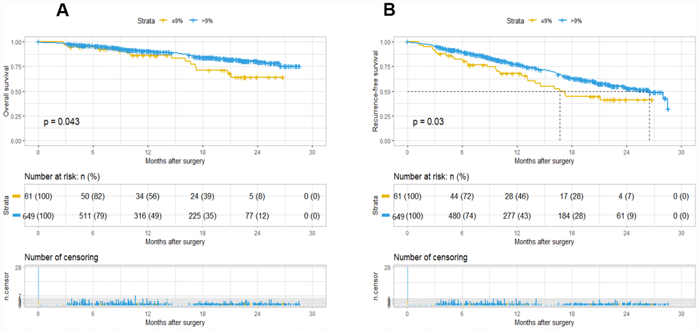 The Kaplan-Meier curve showed that A09 was significantly different for OS (P=0.043) and RFS (P=0.03). A09>9% group had a better overall and recurrence-free survival. The median recurrence-free time was 17 months for A09≤9% group and 26 months for A09≥9% group, but median overall survival was not reached due to inadequate follow-up time (Figure 1). The logistic regression analysis revealed that A09 was associated with gender, AFP stratification, HLNE, PLT, and CA19-9. COX and logistic regression in combination did not found a confounding factor for A09, suggesting A09 as an independent prognostic factor for HCC (Supplementary Table 3). Furthermore, a comparison was made with the prognostic value of current international staging system in the HCC cohort. TNM 8th, BCLC, and liver function system (Child-Pugh, ALBI grade) developed a good stratification for overall and recurrence-free survival in the training cohort (Supplementary Figure 1, Supplementary Table 1–2). A09 were divided into substages, which showed a superior performance in TNM IB (RFS, p=0.038), BCBL B (RFS, p=0.093; OS, p=0.005), ALBI2 (RFS, p=0.021), Child-Pugh A (RFS, p=0.041), and Child-Pugh B (RFS/OS, p=0.00091) (Data not show).