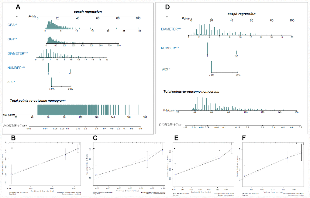 To validate whether A09 is helpful in improving predictive ability, a nomogram was generated using the parameters selected through the multivariate COX regression. A09, tumor number, TMD, GGT, CEA (FDZS5) were incorporated into the model, and concordance of the nomogram at 0.72 showed a superior reliability to TNM (0.667) or BCLC (0.602). Tumor number, TMD and A09 (FDZS3) were incorporated into the nomogram after clinical selection. Concordance at a slightly lower level (0.687) also showed superiority to TNM and BCLC. A09 was further integrated into the TNM and BCLC staging systems to testify probable improvement in performance. A better concordance was observed in the training cohort after adding A09 into the incorporated staging system (0.672 VS 0.667 in TNM; 0.617 VS 0.602 in BCLC). When A09 was combined with individual assessing parameters (tumor number, tumor size, MVI, HLNE in TNM staging system; tumor number, tumor size, MVI, TB, and Child-Pugh in BCLC), a better concordance was observed than without A09 (0.683 VS 0.679 in TNM; 0.678 VS 0.671 in BCLC) (Table 2).