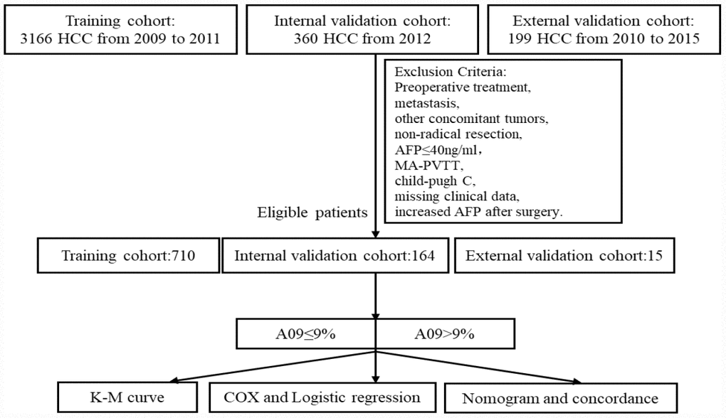 The study with clinical data was approved and reviewed by the Ethics Committee of FDZS and SXYCSU. All data on the patients’ demographics, morbidity, postoperative mortality, and histological findings were obtained from the hospital medical system. All patients were followed up regularly at outpatient clinics of the two hospitals, tumor markers (AFP, CEA, CA19-9) and abdominal ultrasound were conducted every 3 months during the first 2 years, computed tomography or MRI were measured every 6 months or upon suspected recurrence, and further findings at the follow-ups were obtained via telephone by experienced researchers. The median follow-up time was 13.4 months (training), 46 months (internal) and 26 months (external), and the follow-up ended at January 2014 (training), December 2017 (internal), and April 2018 (external). The primary endpoint was death or the end of the follow-up, and the secondary endpoint was dropout from follow-up. Overall survival (OS) was defined as time from surgery until death from any cause, and recurrence-free survival (RFS) as the time from surgery until recurrence. A09 represented a daily post-operative decrease of AFP by 9% as compared to the preoperative level, the calculator was described as below.