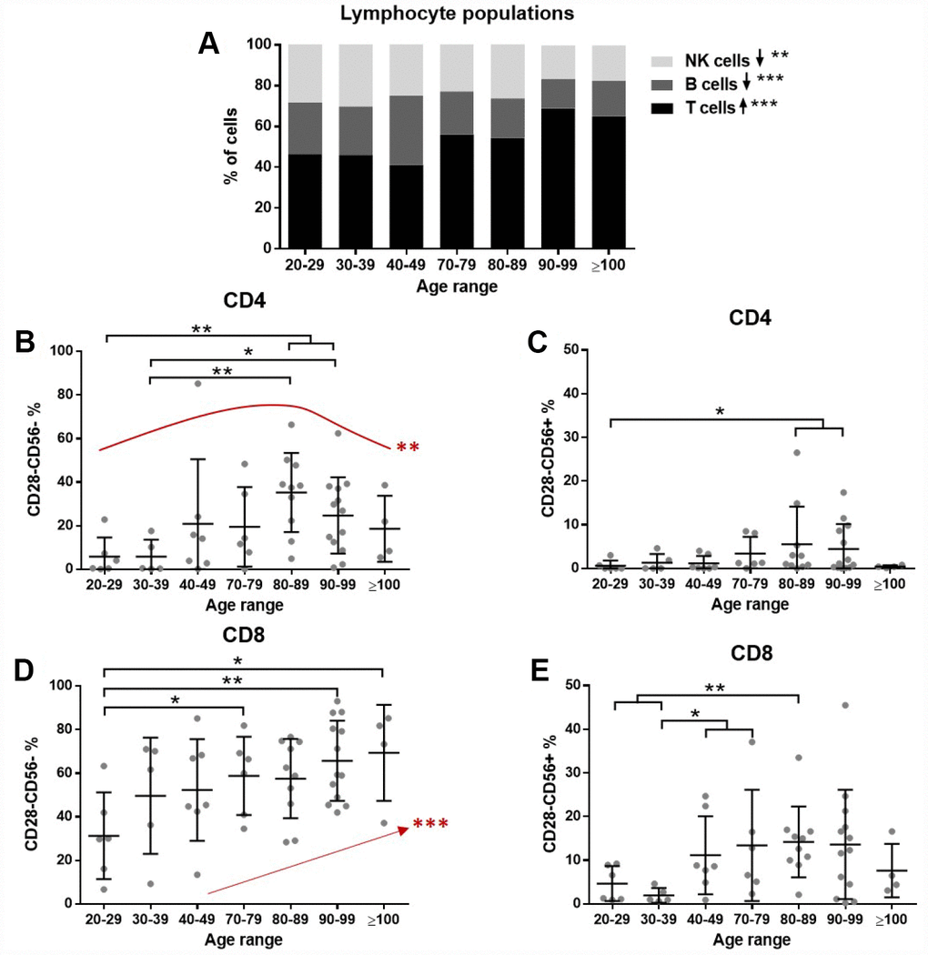 Next, the senescence of T cells was assessed. The gating strategy was set to identify senescent cells based on their loss of CD28 and gain of CD56 expression. Both CD4 and CD8 T cells were analyzed. The results demonstrate a marked increase in the abundance of CD28- cells with age. Moreover, a proportion of CD28- T cells also gained CD56 expression (Figure 1B–1E). This accumulation of senescent cells affects more severely CD8 than CD4 lymphocytes, reaching nearly 80% of CD28- cells (Figure 1D). Interestingly, an increase and subsequent decrease in nonagenarians and centenarians was found for senescent CD4 cells (Figure 1B), while the accumulation of senescent cells was gradually occurring with age in CD8 cells (Figure 1D).