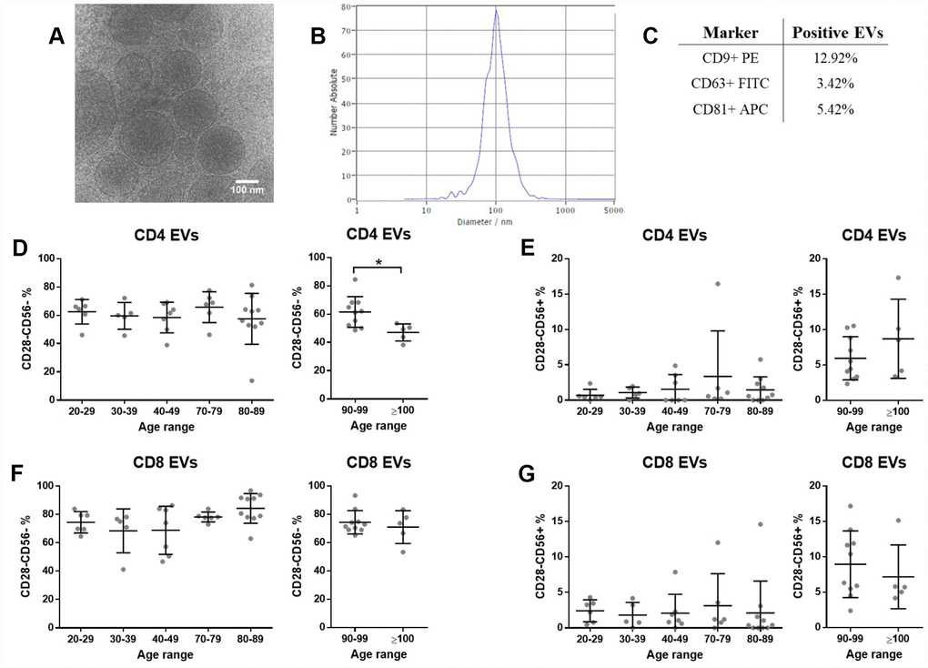 Isolated plasma EVs were characterized by cryo-electron microscopy (cryoEM), nanoparticle tracking analysis (NTA) and flow cytometry. The typical rounded shape was observed (Figure 2A) and most EVs were in the size range of 100–200 nm (Figure 2B). Moreover, we showed by flow cytometry that a proportion of isolated particles bear EV surface markers CD9, CD63 and CD81 tetraspanins (Figure 2C). The presence of T cell characteristic membrane markers on plasma EVs was assessed by flow cytometry and the same gating strategy applied for cells was followed to identify EVs with senescent features. Among CD3+ EVs, CD4+ and CD8+ were distinguished and then, the presence of CD28 and CD56 was evaluated. Our results show that EVs from the bloodstream carry T cell markers, but contrary to PBMCs, EVs with senescent markers do not accumulate with age (Figure 2D–2G). Still, a significant decrease of senescent CD4+ EVs was found between nonagenarians and centenarians (Figure 2D right panel). Besides, for all age ranges, a higher percentage of senescent markers was observed among CD8+ EVs when compared to CD4+ EVs (Figure 2D and 2F).