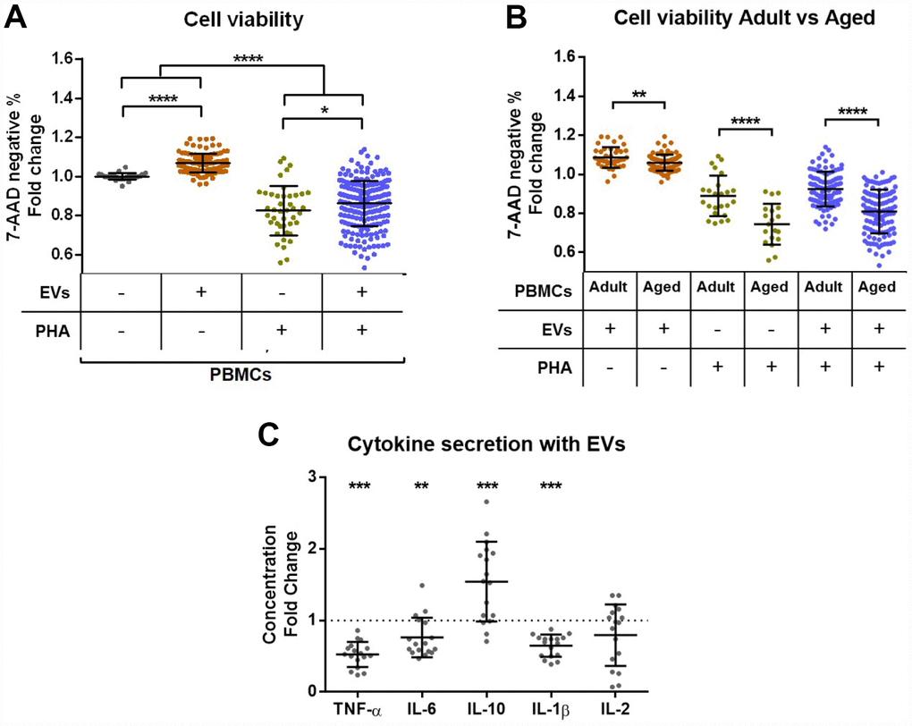 In order to check whether the coculture with EVs could also affect cytokine production in vitro, we performed a luminex assay for TNF-α, IL-6, IL-10, IL-1β and IL-2. Cell conditioned media from all conditions of 2 different individuals (one adult and one aged cell donor, cocultured with EVs from adults and elders) were tested. Importantly, cytokine concentrations were non-detectable in the two conditions where PHA was not added (data not shown), demonstrating that the only addition of EVs does not induce cytokine production. When compared to PHA stimulation alone, we observed that EV addition influences cytokine production. The secretion of the proinflammatory TNF-α, IL-6 and IL-1β cytokines was reduced, while anti-inflammatory IL-10 was increased and IL-2 not significantly affected (Figure 3C).
