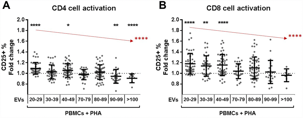Finally, the effect of plasma EVs on lymphocyte activation was assessed. Polyclonal activation of T cells was induced with PHA and measured by CD25 expression by flow cytometry. The coculture of lymphocytes with plasma EVs for 72h did not induce T cell activation (Supplementary Figure 6A, 6B), demonstrating that plasma EVs alone are not immunogenic for non-stimulated cells. PBMC samples of 22 individuals (12 adults and 10 elders) were tested, and each cell donor was assayed with different EV donors (up to 12 different EVs for one PBMC donor, each one in different wells and always in duplicate). The percentage of T cells activated under the same PHA stimulation (and without EVs) was highly heterogeneous for each PBMC donor (33–92 % of CD25+, Supplementary Figures 5B, 5C and 6A, 6B) For normalization, control wells with PBMCs + PHA without EVs were used and fold change was calculated.