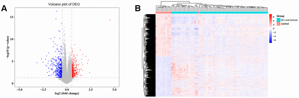 A total of 3525 DEGs, 1793 downregulated and 1732 upregulated, were identified in cirrhosis and HCC samples compared to control samples (Figure 1A). Cluster analysis showed that these DEG patterns could basically distinguish cirrhosis and HCC tissues from normal liver tissues (Figure 1B).