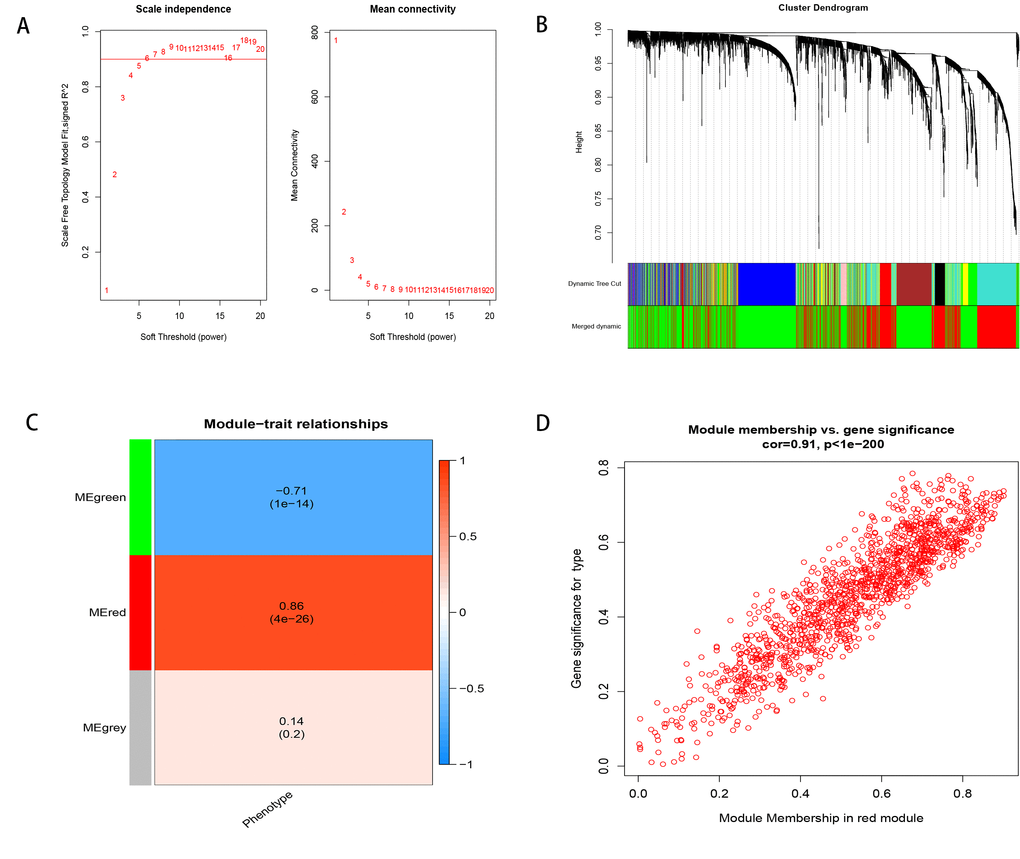 To find the key module most associated with the progression from cirrhosis to HCC, WGCNA was performed using the expression profile of the DEGs. The power was 7, which was the lowest value for the scale with an independence degree of up to 0.90 (Figure 2A). Three modules were identified (Figure 2B). The red module was positively correlated with phenotype (correlation coefficient = 0.86, P = 4E-26; Figure 2C), while the green module was negatively correlated with phenotype (correlation coefficient = -0.71, P = 1E-14; Figure 2C). This finding indicated that with the progression from cirrhosis to HCC, the expression patterns of the red module genes showed an increasing trend, while those of the green module genes showed a decreasing trend. The red module was selected as our candidate module in which to identify hub genes. The module membership (MM) and gene significance (GS) were highly associated in the red module (Figure 2D).