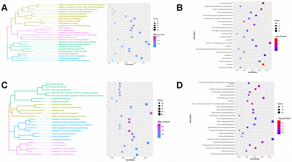 Red module genes were significantly involved in biological processes related to cell proliferation and differentiation (Figure 3A) and in cirrhosis- or HCC-related pathways, such as hepatitis B and the TNF and P53 signaling pathways (Figure 3B). Green module genes were significantly enriched in biological processes related to T cells, leukocytes and lymphocytes (Figure 3C) and in the MAPK signaling pathway (Figure 3D).