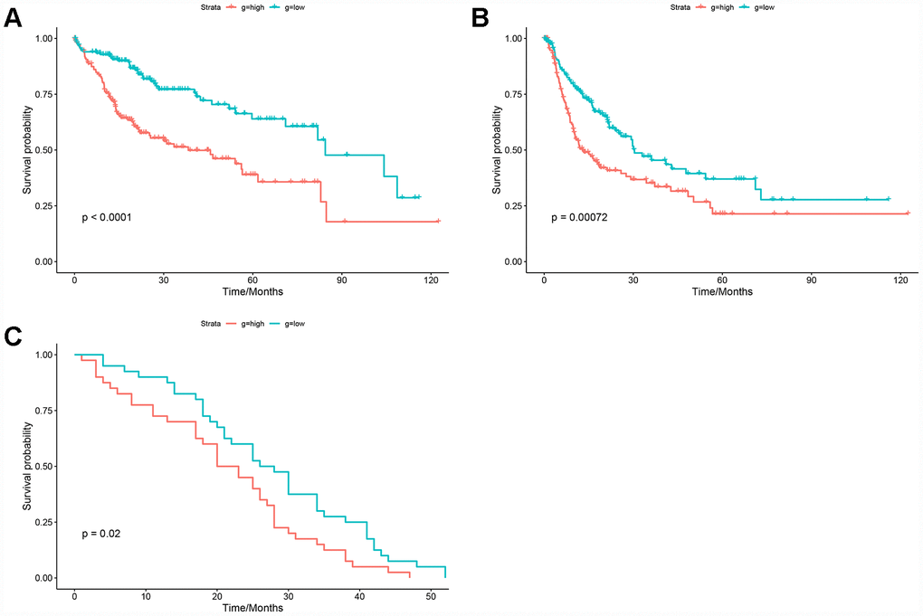 The HGSVA score in peripheral blood samples was significantly higher for patients with HCC than for healthy controls (Figure 4E). ROC curve analysis showed that the HGSVA score has potential as a blood-based marker for HCC (AUC=0.850, Figure 4F). The HGSVA score was significantly associated with the OS (Figure 5A) and RFS of patients with HCC (Figure 5B). This result was consistent with that for GSE49515 (Figure 5C). Among patients with HCC, those in the high HGSVA score group had a shorter OS and RFS. than those in the low score group. Furthermore, univariate and multivariate Cox analyses showed that the HGSVA score was a significantly independent factor for both OS (Table 1) and RFS (Table 2) after adjusting for routine clinicopathological features