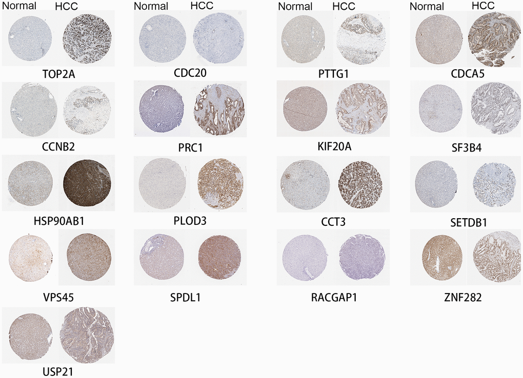Seventeen identified genes are included in The Human Protein Atlas, and all were highly expressed in HCC compared to normal liver (Figure 6). The antibodies against these proteins are listed in Supplementary Table 1. These data provide strong support for our results. FOXD2, MED24 and KIAA0101 are not in The Human Protein Atlas.