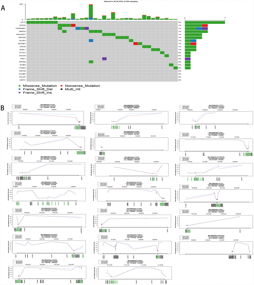 The 20 hub genes were scanned for genetic alterations (Figure 7A), and a few samples had mutations (9.34%). This finding indicated that mutation may not be the cause of the differential gene expression. Compared to normal liver tissue, HCC tissue harbored one or more differentially methylated sites in the 20 hub genes; therefore, the upregulation of the hub genes was driven by hypomethylation (Figure 7B).