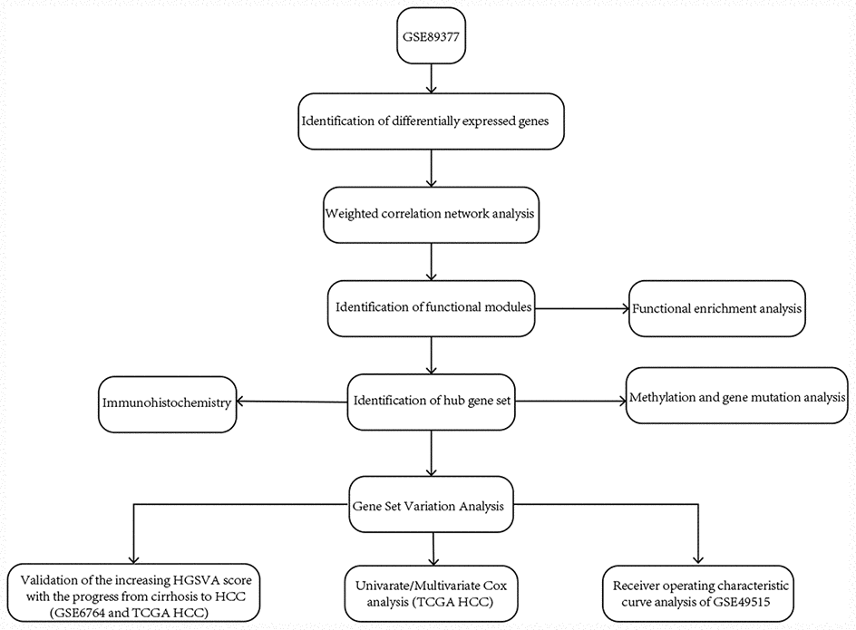 We downloaded the hepatic tissue gene expression profiles in GSE89377 from the GEO website (https://www.ncbi.nlm.nih.gov/) [27]; this dataset includes 13 normal liver, 8 low-grade chronic hepatitis, 12 high-grade chronic hepatitis, 12 cirrhosis, 11 low-grade dysplastic nodules, 11 high-grade dysplastic nodules, 5 early HCC, 9 grade 1 HCC, 12 grade 2 HCC and 14 grade 3 HCC. GSE89377 is based on GPL6947. The gene expression profiles in GSE6764 [28] are based on GPL570, including 10 normal controls, 10 cirrhotic liver tissues, 3 cirrhotic liver tissues from patients without HCC, 9 low-grade dysplastic liver tissues, 7 high-grade dysplastic liver tissues, 8 very early HCC, 10 early HCC, 6 advanced HCC, and 9 very advanced HCC. The whole blood gene expression profiles in GSE49515 [29] are based on GPL570, including 10 HCC and 10 normal controls. The gene expression profiles in GSE54236 [30] are based on GPL6480, including 81 HCC and 80 normal controls. The normalizeBetweenArrays function in the limma package [31] was used to normalize the gene expression profiles. If a gene corresponded to multiple probes, the average expression value of these probes was chosen as the expression value of the gene. Eight low-grade chronic hepatitis and 12 high-grade chronic hepatitis samples in GSE89377 and 3 cirrhotic liver tissues from patients without HCC in GSE6764 were removed from the analysis in the present study. RNA sequencing (displayed as read count) and clinical information of HCC were downloaded from The Cancer Genome Atlas (TCGA, https://www.cancer.gov/) [32]. The workflow of the present study is shown in Figure 8.