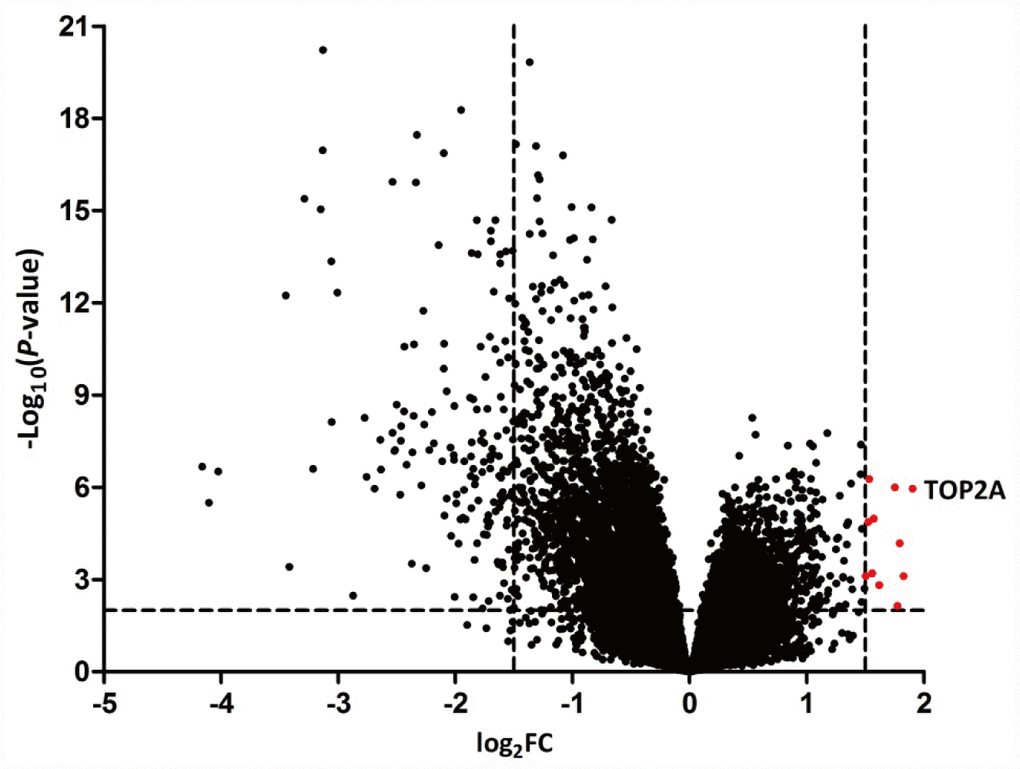 To confirm the relationship between TOP2A (the most significantly upregulated DEG) and patient prognosis, we analyzed TOP2A protein expression in a tissue microarray (TMA) of NSCLC samples by immunohistochemistry (IHC). TOP2A signal localized mainly in the nucleus and to a lesser extent in the cytoplasm of tumor cells. TOP2A immunoreactivity was next categorized into four levels, i.e. “-”, “+”, “++”, and “+++”, according to the intensity and density of TOP2A-positive cells in each sample (Figure 6E). Using sample-associated clinical data, Kaplan-Meier analysis confirmed that patients with high TOP2A expression had significantly worse OS (P = 0.0259) (Figure 6F). These results strongly suggest that assessment of TOP2A expression, at the protein and/or mRNA levels, could be a valuable aid for NSCLC prognosis evaluation.
