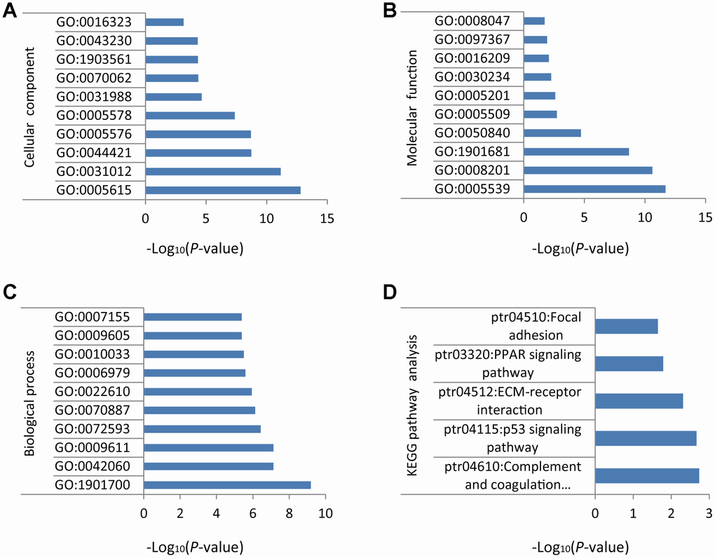 GO enrichment analysis was conducted on the 118 DEGs identified above. For cellular component (CC), the top ten terms were GO: 0005615~extracellular space, GO: 0031012~extracellular matrix, GO: 0044421~extracellular region part, GO: 0005576~extracellular region, GO: 0005578~proteinaceous extracellular matrix, GO: 0031988~membrane-bounded vesicle, GO: 0070062~ extracellular exosome, GO: 1903561~extracellular vesicle, GO: 0043230~extracellular organelle, and GO: 0016323~basolateral plasma membrane (Figure 2A). For molecular function (MF), the top ten terms were GO: 0005539~glycosaminoglycan binding, GO: 0008201~heparin binding, GO: 1901681~sulfur compound binding, GO: 0050840~extracellular matrix binding, GO: 0005509~calcium ion binding, GO: 0005201~extracellular matrix structural constituent, GO: 0030234~enzyme regulator activity, GO: 0016209~antioxidant activity, GO: 0097367~carbohydrate derivative binding, and GO: 0008047~enzyme activator activity (Figure 2B). For biological process (BP), the top ten terms were GO: 1901700~response to oxygen-containing compound, GO: 0042060~wound healing, GO: 0009611~response to wounding, GO: 0072593~reactive oxygen species metabolic process, GO: 0070887~cellular response to chemical stimulus, GO: 0022610~biological adhesion, GO: 0006979~response to oxidative stress, GO: 0010033~response to organic substance, GO: 0009605~response to external stimulus, and GO: 0007155~cell adhesion (Figure 2C).