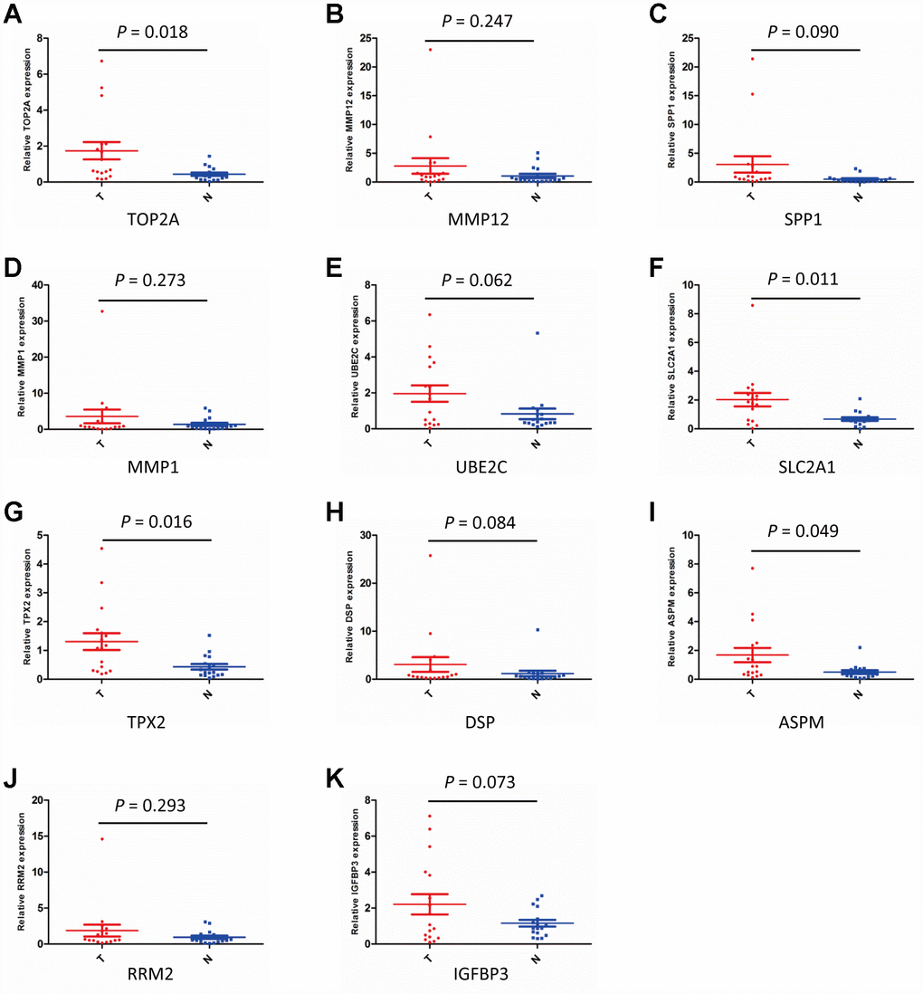 The DEGs upregulated in NSCLC were selected for validation by quantitative real-time PCR (qPCR) on 17 paired NSCLC/adjacent non-tumor samples collected from surgical patients. The overall trend indicated that all the upregulated DEGs from the GEO database were also overexpressed at the mRNA level in our clinical NSCLC specimens. However, overexpression in NSCLC samples vs normal lung tissues was only significant for TOP2A (P = 0.018), SLC2A1 (P = 0.011), TPX2 (P = 0.016), and ASPM (P = 0.049) (Figure 3A–3K).
