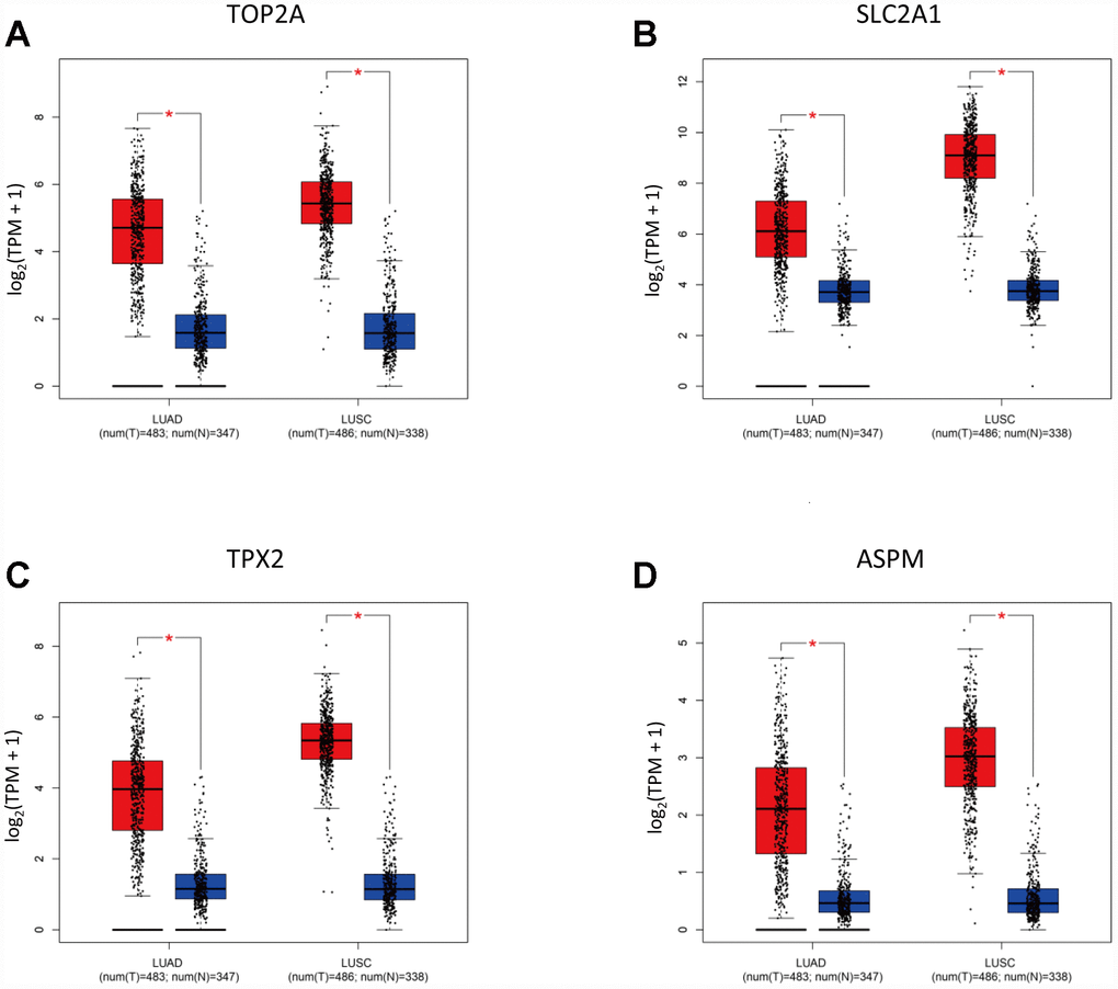 Using Gene Expression Profiling Interactive Analysis (GEPIA), a newly developed interactive web server for analyzing RNA-Seq expression data, we confirmed on NSCLC datasets retrieved from TCGA and GTEx projects that TOP2A (P < 0.05), SLC2A1 (P < 0.05), TPX2 (P < 0.05), and ASPM (P < 0.05) were upregulated in lung adenocarcinoma (LUAD) and lung squamous cell carcinoma (LUSC) specimens, compared to adjacent normal lung samples (Figure 4A–4D).
