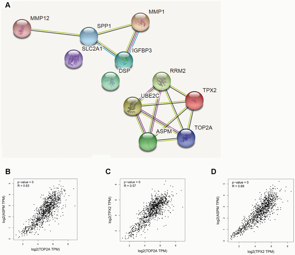 We used the STRING database (https://string-db.org/) to construct protein-protein interaction (PPI) networks for 11 DEGs upregulated in NSCLC (Figure 5A). Results showed that TOP2A, TPX2, and ASPM were interconnected. GEPIA was next used to conduct correlation analysis on these three genes. The correlation coefficients for TOP2A & ASPM, TOP2A & TPX2, and TPX2 & ASPM were 0.63, 0.57, and 0.69 respectively (P = 0.000) (Figure 5B–5D). These data suggest that overexpression of TOP2A, TPX2, and ASPM may significantly impact the development or progression of NSCLC.