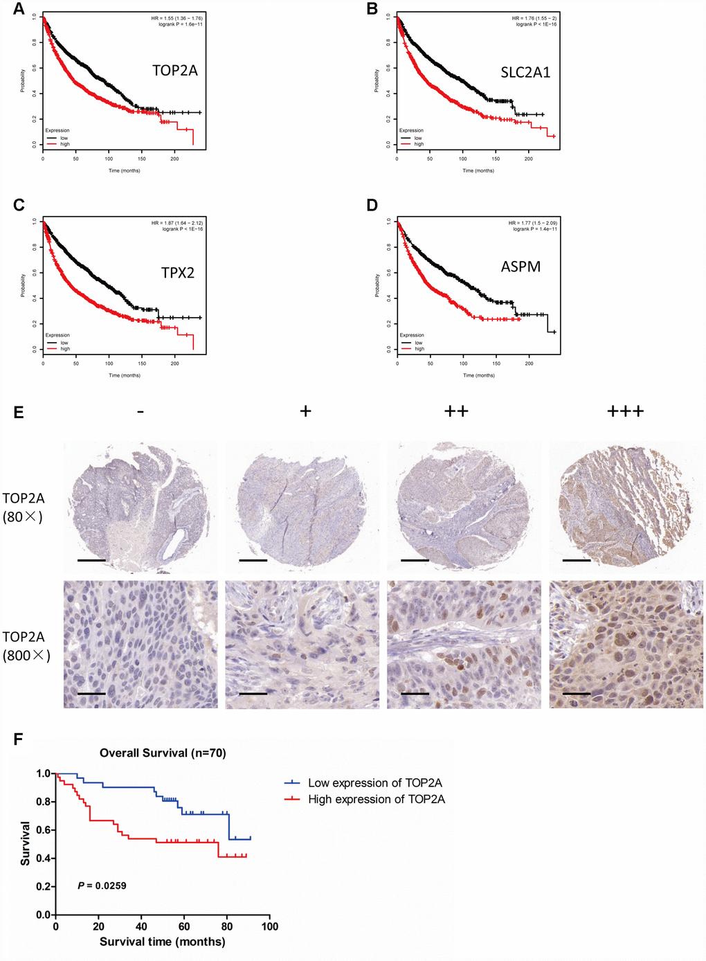 Our survival analyses on the Kaplan-Meir plotter tool indicated that upregulation of TOP2A, SLC2A1, TPX2, and ASPM independently predicted poor OS in NSCLC patients. Moreover, for TOP2A, high expression was associated with poor OS in Stage 1, Stage T1, Stage N0, and Stage M0 NSCLC patients. An association between TOP2A and poor OS was further confirmed by assessing protein expression by IHC in a NSCLC TMA. These results indicated that TOP2A expression levels may aid prognosis evaluation in early-stage lung cancer patients.