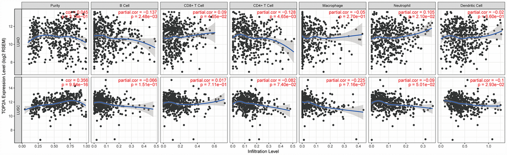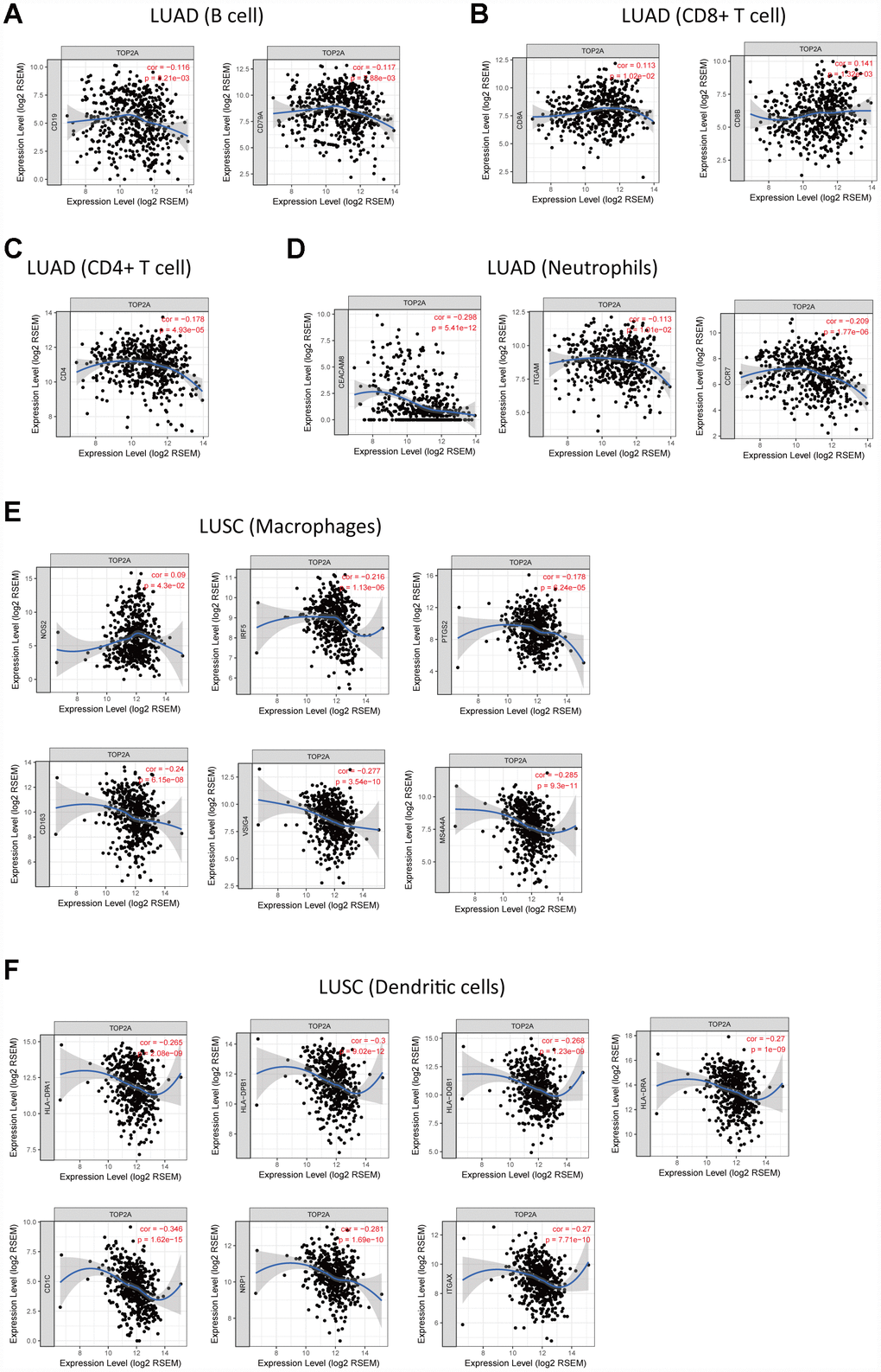 Tumor-infiltrating immune cells may restrict or promote tumor growth and thus play a critical role in tumor development. Therefore, we investigated the relationship between TOP2A expression and immune infiltration in NSCLC using Tumor IMmune Estimation Resource (TIMER), which allows systematic analysis of immune infiltrates across diverse cancer types (https://cistrome.shinyapps.io/timer/). Six immune cell types (B cells, CD4+ T cells, CD8+ T cells, neutrophils, macrophages, and DCs) were assessed by TIMER against TCGA lung cancer datasets. Results showed a slight correlation of TOP2A expression with B cells (partial.cor = -0.137, P = 2.48e-03), CD4+ T cells (partial.cor = -0.128, P = 4.65e-03), CD8+ T cells (partial.cor = 0.09, P = 4.65e-02), and neutrophils (partial.cor = 0.105, P = 2.10e-02) in LUAD, and with macrophages (partial.cor = -0.225, P = 7.16e-07) and DCs (partial.cor = -0.1, P = 2.93e-02) in LUSC (Figure 7). The further define the correlation between TOP2A expression and immune infiltrates in lung cancer, gene markers of tumor-infiltrating immune cells were also evaluated. Again, slight correlations with TOP2A levels were determined for gene markers of B cells, CD4+ T cells, CD8+ T cells, neutrophils, macrophages, and DCs (Figure 8A–8F). Especially, we detected a more significant negative correlation between TOP2A expression and gene markers of DCs in LUSC (HLA-DPA1: cor = -0.265, P = 2.08e-09; HLA-DPB1: cor = -0.3, P = 9.02e-12; HLA-DQB1: cor = -0.268, P = 1.23e-09; HLA-DRA: cor = -0.27, P = 1e-09; CD1C: cor = -0.346, P = 1.62e-15; NRP1: cor = -0.281, P = 1.69e-10; ITGAX: cor = -0.27, P = 7.71e-10) (Figure 8F). Therefore, we speculate that TOP2A overexpression might influence antitumor immune responses in the NSCLC microenvironment.