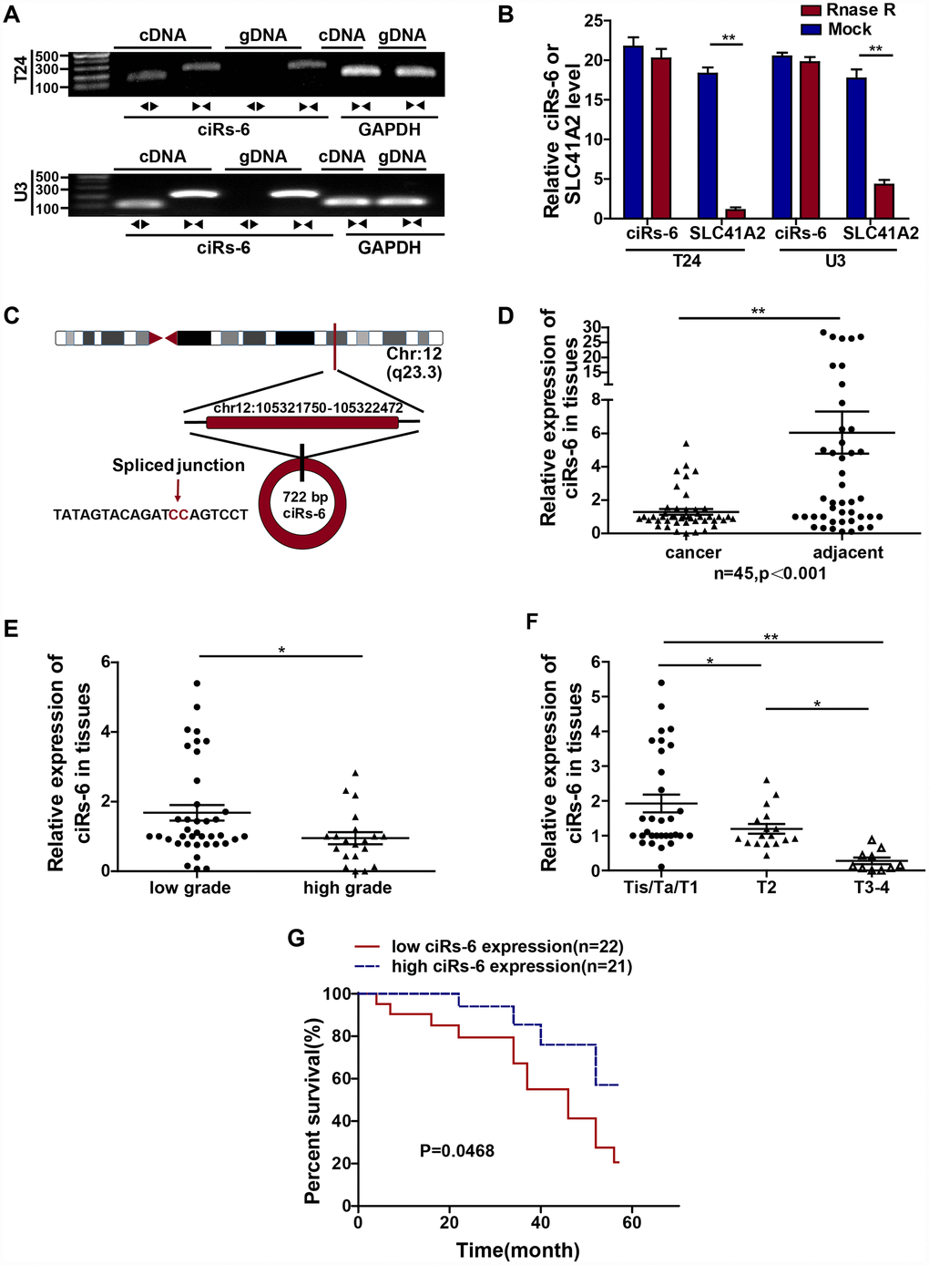 As a result of deep sequencing and a novel bioinformatics approach, numerous circular RNAs have been identified. Unfortunately, few circular RNAs have been proved to play a role in driving cancer progression recently [3, 7, 11]. According to our previous RNA-seq analysis in 2 paired bladder cancer tissues, ciRs-6 was significantly downregulated in bladder cancer tissues compared to normal controls [10]. Clinical pathological analysis revealed that higher ciRs-6 levels negatively correlated with tumor grade, TNM stage and overall survival of bladder cancer patients. As demonstrated in multiple studies in either plasma or tissue, the varied expression of circular RNAs statistically correlated with different clinical features. Combined with the results of ciRs-6 shown here, the data suggest that ciRs-6 may serve as a potential biomarker to assist in cancer diagnosis and patient follow-up, as many people are reluctant to undergo invasive cystoscopy tests [12]. Hence, future studies should use larger sample cohorts and samples from different ethnic regions to further analyze the potential of ciRs-6 as a biomarker for bladder cancer.
