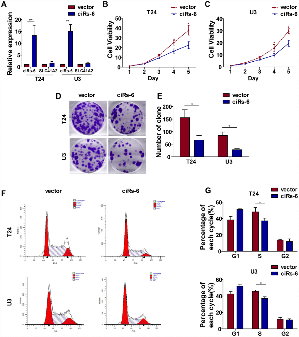 Cell proliferation and metastasis are 2 main characteristics of cancer progression. To detect the role of ciRs-6 in bladder cancer, we first designed 3 siRNAs, and their efficacy in silencing ciRs-6 expression was determined by qPCR. It was found that all 3 siRNAs could silence ciRs-6 without effecting SLC41A2 (Supplementary Figure 1A). We analyzed proliferation as the first step. It was found that bladder cancer viability was significantly improved when cells were treated with siRNAs (Supplementary Figure 1B, 1C), and the clone forming assay showed increased clone formation as well (Supplementary Figure 1D, 1E). Moreover, cells were stained for cell cycle analysis, and there was an elevated percentage of cells in S phase following siRNA treatment (Supplementary Figure 1F–1H). These results suggested that silencing ciRs-6 promotes proliferation of bladder cancer cells. However, there was no obvious phenotype to show the role of ciRs-6 in cancer metastasis, as demonstrated by in vitro transwell and wound healing assays (Supplementary Figure 2A–2C). Moreover, stable bladder cancer cell lines overexpressing ciRs-6 were constructed, and the efficacy of overexpression was determined by qPCR (Figure 2A). Similar to the assays mentioned before, a lower cell viability (Figure 2B, 2C), clone formation ability (Figure 2D, 2E) and percentage of cells in S phase (Figure 2F, 2G) were observed when ciRs-6 was overexpressed in bladder cancer cells. Moreover, to prove that this reduced cell growth was due to changes in apoptosis, we performed an Annexin V/PI assay. The results showed that overexpression of ciRs-6 in bladder cancer cells led to less apoptosis (Supplementary Figure 5B, 5C). In a subcutaneous tumor xenograft model, there was a significant positive effect of tumor suppression when ciRs-6 was overexpressed (Figure 2H), as indicated by a decrease in tumor volume (Figure 2I) and weight (Figure 2J). In conclusion, the results above suggest that ciRs-6 suppresses bladder cancer growth.