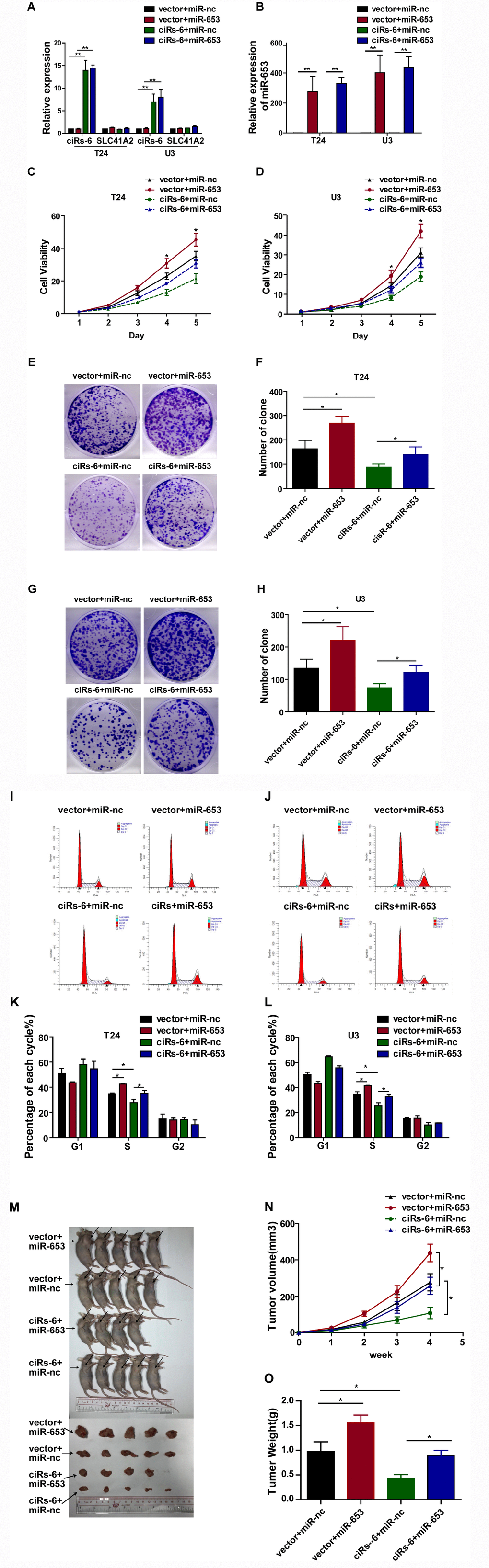 To further evaluate how ciRs-6 sponging of miR-653 resulted in a tumor suppressive effect, a series of rescue assays were developed. Through CCK8 assays, clone forming assays, S phase analysis and in vivo assessment with a subcutaneous tumor model, miR-653 was found to significantly promote cell viability (Figure 4C, 4D), clone formation (Figure 4E–4H), the percentage of cells in S phase (Figure 4I–4L) and tumor formation in vivo (Figure 4M–4O). However, when miR-653 was co-overexpressed with ciRs-6 in bladder cancer cells, either the tumor suppressive role of ciRs-6 or the oncogenic role of miR-653 was reversed, making the results similar to those of wild type results in vitro and in vivo (here, as indicated by vector-treated cells) (Figure 4A–4O). Hence, these results suggest that ciRs-6 suppresses bladder cancer growth by sponging miR-653.