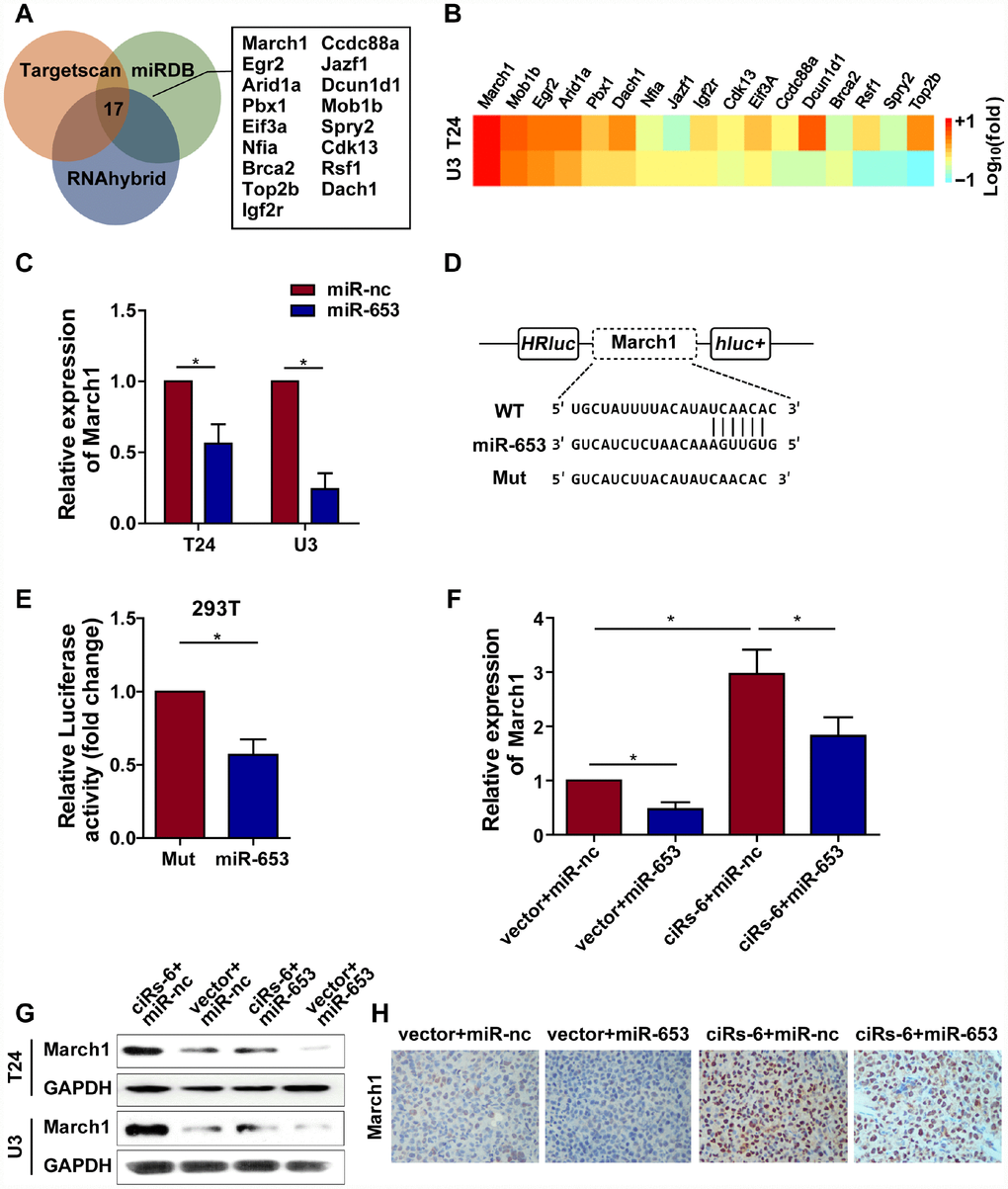March1 is an E3 ubiquitin-ligating enzyme that has known functions in the immune system. As reported previously, March1 was highly expressed in APCs (antigen presenting cells) to prevent MHC class II recycling and promote lysosomal targeted degradation, thus blocking acute APC activation and reducing efficient antigen presentation to CD4 T cells [14, 15]. Although previous studies on March1 focused less on cancer biology, Ying Meng et al. suggested that March1 was overexpressed in ovarian cancer tissues compared with normal control tissues. Silencing March1 inhibits proliferation, migration and invasion of ovarian cancer cells by affecting the NF-κB and Wnt/β-catenin pathways [16]; Xie L et al. demonstrated that March1 promotes tumor progression of hepatocellular carcinoma via regulation of the PI3K-AKT pathway [17, 18]. This suggests that March1 plays a role in cancer biology and partially supports our findings regarding ciRs-6/miR-653-5p/March1 in bladder cancer. However, the underlying mechanisms in suppressing bladder cancer growth remain unclear.