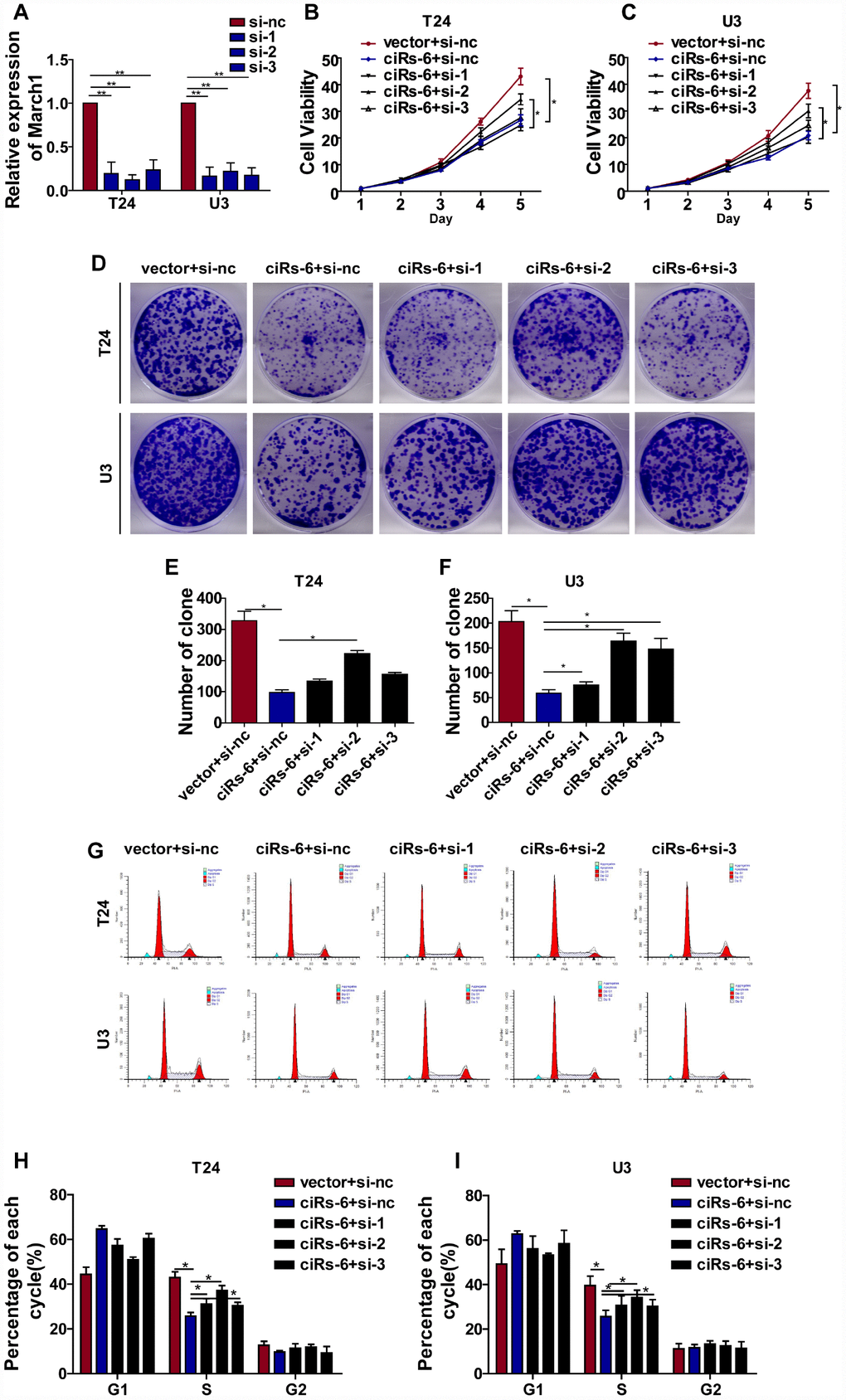 Because ciRs-6 sponges miR-653, we used Targetscan, miRDB and RNAhybrid to predict the downstream targets of miR-653. Seventeen targets were identified by all 3 websites (Figure 5A). Then, we performed qPCR analysis to detect the mRNA levels of these 17 targets when ciRs-6 was overexpressed. March1 was found to be elevated by 40-fold in T24 cells and 31-fold in U3 cells when ciRs-6 was overexpressed (Figure 5B). This result suggested that March1 might be rescued by ciRs-6 from miR-653. Additionally, miR-653 was shown to reduce March1 levels at both the mRNA and protein levels (Figure 5C, 5G5H); further, overexpression of miR-653 significantly reduced luciferase activity from the March1 reporter, which verified the interaction between March1 and miR-653 (Figure 5D, 5E). These results suggest that March1 is the direct downstream target of miR-653. Moreover, to verify the working axis of ciRs-6/miR-653/March1, when miR-653 was co-overexpressed with ciRs-6 in bladder cancer cells, the level of March1 was obviously decreased to a level that was similar to what was observed in wild-type cells (here, as shown in vector) (Figure 5F–5H). These results suggest that ciRs-6 sponging of miR-653 elevates March1 levels. To further verify that ciRs-6 suppressed bladder cancer growth by elevating March1 levels, we designed 3 siRNAs to silence March1 (Figure 6A). March1 expression was significantly silenced (Figure 6A), and there was little effect on ciRs-6 and miR-653 expression (Supplementary Figure 5A). Silencing March1 reversed the tumor suppressive role of ciRs-6 on bladder cancer cells, which resulted in improved cell viability (Figure 6B, 6C), higher clone formation ability (Figure 6D–6F) and a higher percentage of cells in S phase (Figure 6G–6I). In summary, these data indicate that the tumor suppressive role of ciRs-6 was driven by March1 elevation in bladder cancer.