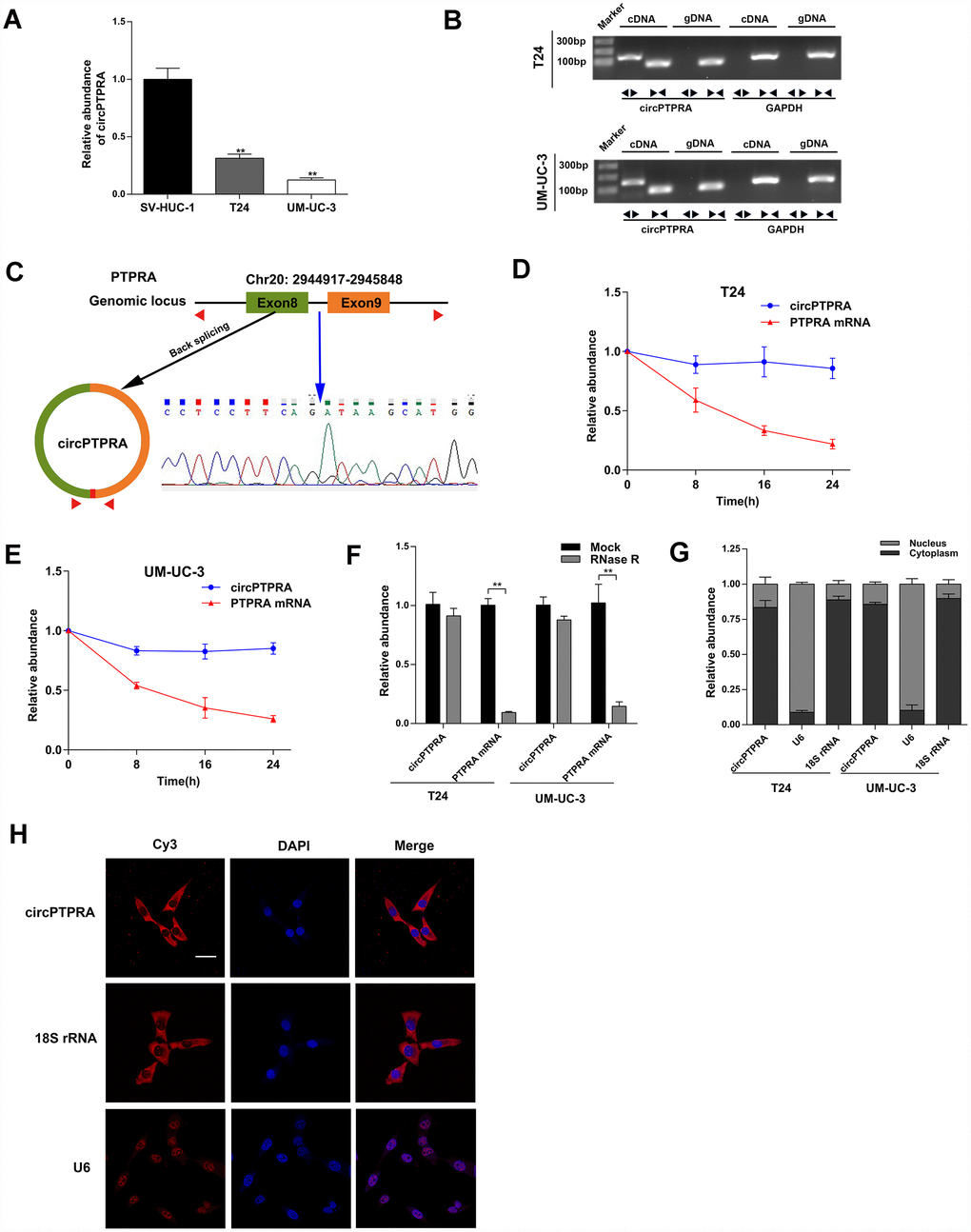 T24 and UM-UC-3 cell cultures were supplemented with 2μg/mL actinomycin D (Sigma, USA) for various time points. Total RNA extracted from T24 and UM-UC-3 cells was treated with RNase R (Epicenter Technologies, USA) according to manufacturer’s instructions for 30min at 37 °C. The stability of circPTPRA and PTPRA mRNA was analyzed by qRT-PCR.