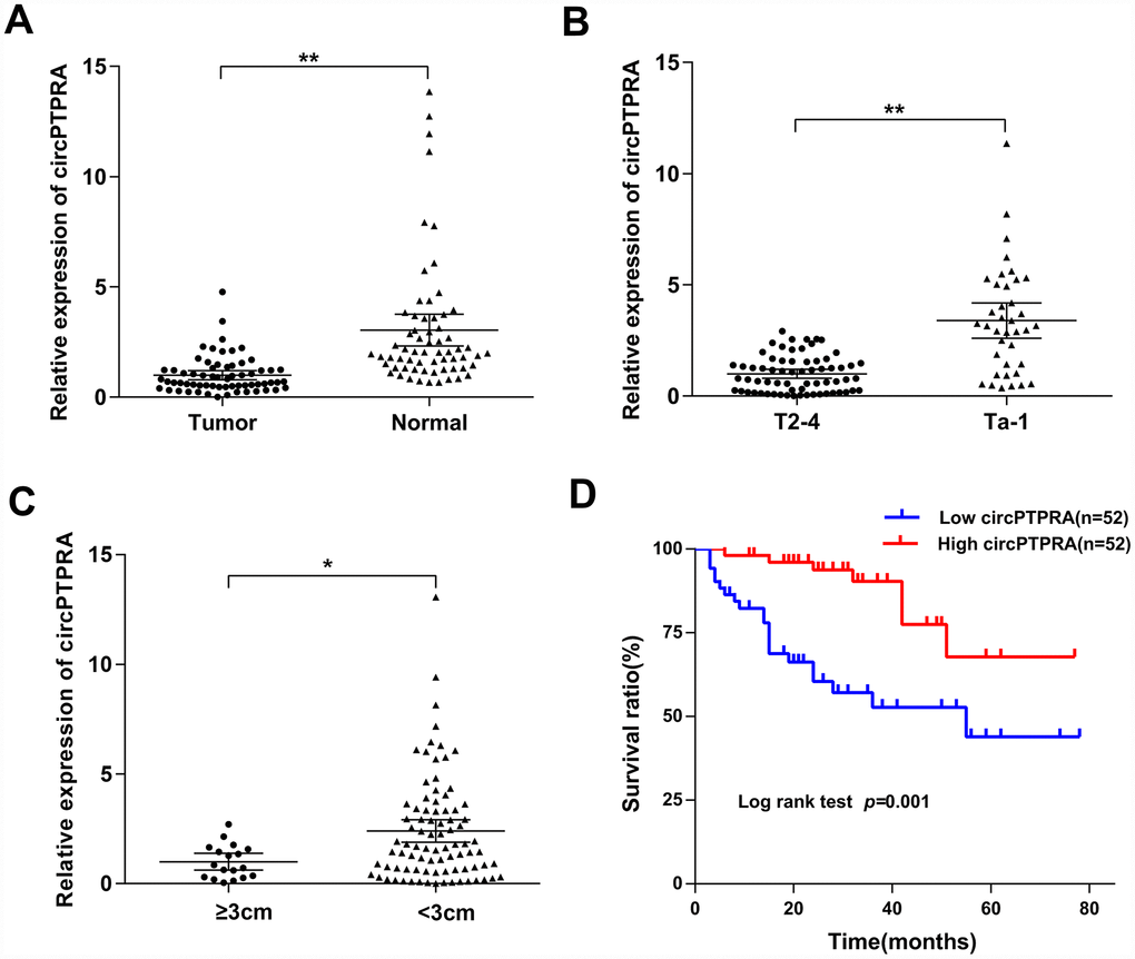 To further verify the expression of circPTPRA in BC, 64 matched BC and adjacent normal specimens were analyzed by qRT-PCR. Results confirmed that circPTPRA was downregulated in BC tissues compared with normal tissues (Figure 2A). Additionally, we analyzed the expression of circPTPRA in 104 BC specimens and found that both advanced tumor stage (T2-T4) and tumor size (≥3cm) correlated with low circPTPRA expression (Figure 2B, 2C). Then we divided patient samples into high and low circPTPRA groups, and the Chi-square test indicated that circPTPRA expression was indeed associated with tumor stage and size, but not with other clinical parameters (Table 1). Moreover, survival analyses indicated poor prognosis for BC patients with low circPTPRA expression (Figure 2D).