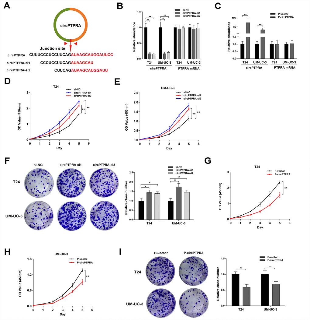 To illustrate the function of circPTPRA in BC cells, gain- and loss-of-function assays were performed in vitro. First, two siRNAs targeting the back-splicing junction site of circPTPRA were designed (Figure 3A). The expression of circPTPRA was significantly decreased after transfection of these siRNAs in BC cells, but without obvious changing in the level of PTPRA mRNA (Figure 3B). After construction of BC cell lines with stable expression of circPTPRA, qRT- PCR analysis confirmed that circPTPRA was overexpressed in those cells, but not in cells expressing a control vector (Figure 3C). Next, cell viability and colony formation assays showed that circPTPRA knockdown promoted the proliferation of BC cells (Figure 3D–3F). Conversely, and as expected, overexpression of circPTPRA inhibited BC cells proliferation (Figure 3G–3I).