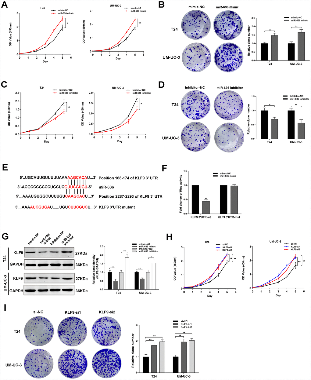 Based on results from Targetscan (http://www.targetscan.org/vert_72/) and miRDB (http://mirdb.org/) databases, we focused on the KLF9 gene, whose transcript contains the binding site for miR-636 in its 3’UTR. After constructing a luciferase reporter plasmid containing wild-type KLF9 3’UTR or a mutant type KLF9 3’UTR variant (Figure 5E), reporter assay results demonstrated that miR-636 significantly decreased the Rluc activity of KLF9 3’UTR, but did not affect the activity of its mutant form (Figure 5F). In turn, western blot analysis showed that miR-636 negatively regulated the expression of KLF9 (Figure 5G), while in vitro assays indicated that KLF9 silencing promoted the proliferation of BC cell lines (Figure 5H, 5I)