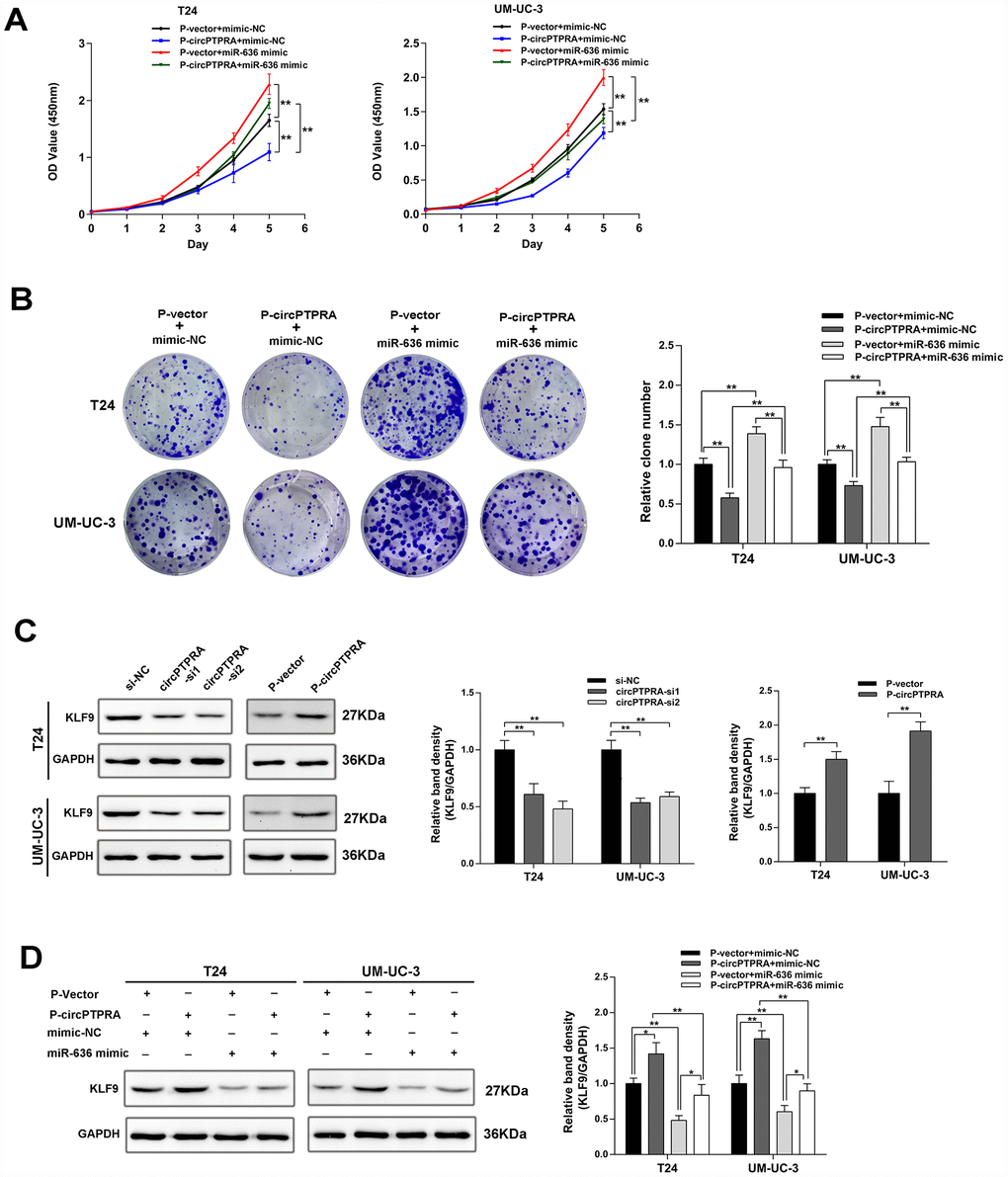 Given that circPTPRA and KLF9 mRNA shared a common miR-636 binding motif, we inferred that circPTPRA might regulate the expression of KLF9 by competitively sponging miR-636. A functional assay revealed that miR-636 mimic partially reversed the inhibition of cell proliferation induced by circPTPRA (Figure 6A, 6B). In addition, western blot showed a positive association between KLF9 and circPTPRA expression (Figure 6C). After co-transfection of circPTPRA and miR-636 mimic, partial abrogation of the repression exerted by miR-636 on KLF9 was evident (Figure 6D). Taken together, these data suggest that circPTPRA restricts the proliferation of BC cells by suppressing miR-636-mediated silencing of KLF9 mRNA translation.