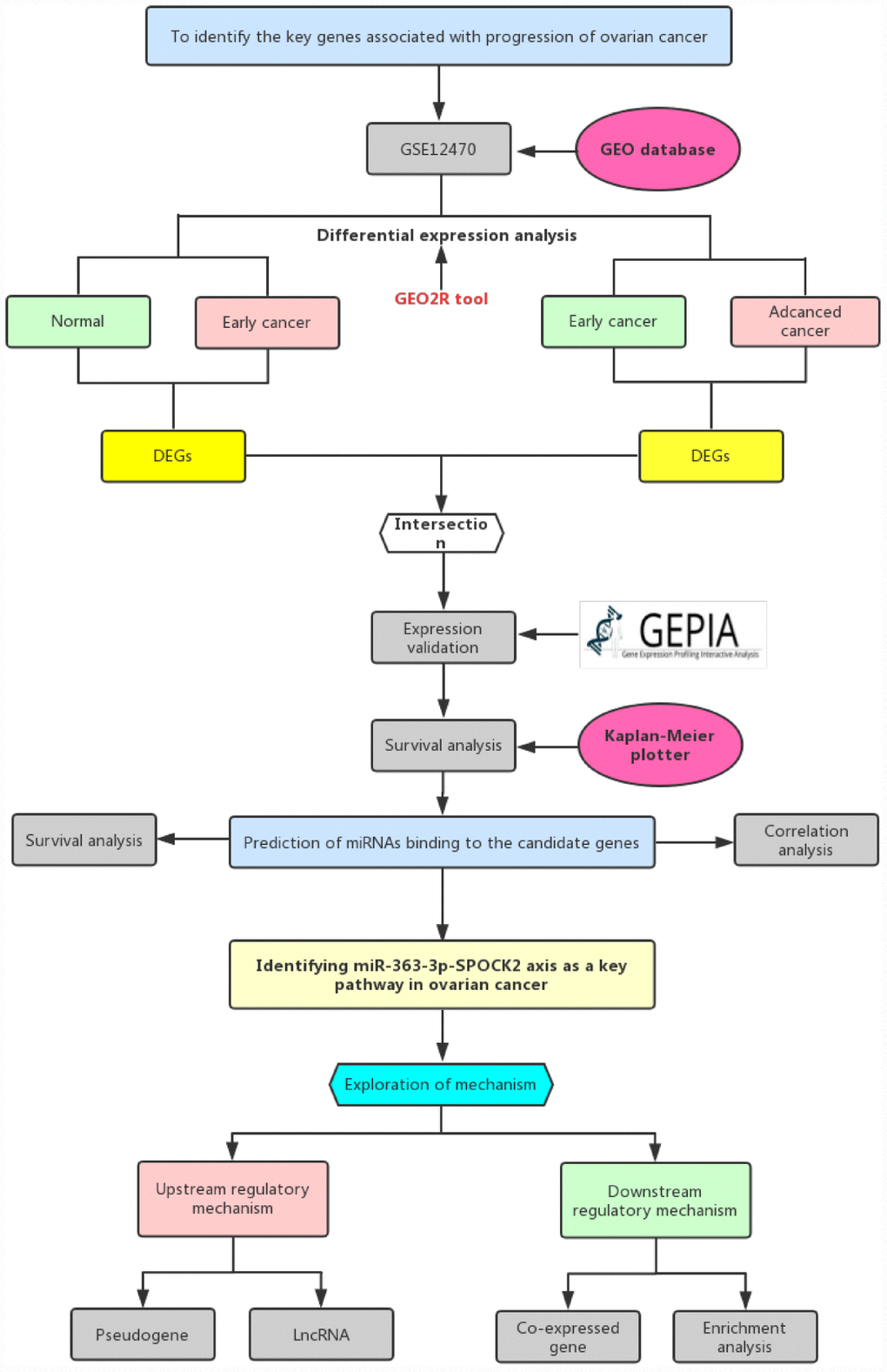In this study, we constructed a network linked to stage progression of ovarian cancer by a series of analytic processes (Figure 1). Firstly, we obtained differentially expressed genes (DEGs)-associated with stage progression of ovarian cancer using GEO dataset, GSE12470. Next, TCGA ovarian cancer cohort was employed to validate expression of these DEGs and perform survival analysis. Subsequently, upstream miRNAs of SPOCK2 were predicted. By expression correlation analysis and survival analysis, the most potential miRNA (hsa-miR-363-3p) binding to SPOCK2 was identified. Finally, the potential upstream dysregulated mechanisms (pseudogenes and lncRNAs) and downstream modulatory pathway were explored. The established pseudogene/lncRNA-hsa-miR-363-3p-SPOCK2 pathway shed novel insight into molecular mechanism of ovarian cancer progression and may provide effective therapeutic targets and promising prognostic biomarkers for ovarian cancer.