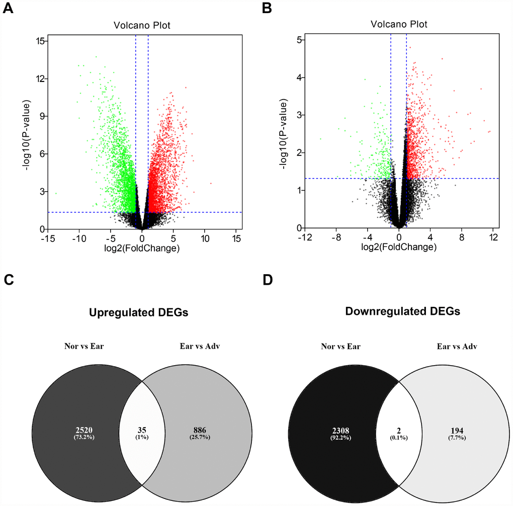 The differentially expressed genes (DEGs) were obtained by conducting differential expression analysis. GEO2R (http://www.ncbi.nlm.nih.gov/geo/geo2r), an online analytic tool provided by the GEO database, was employed to perform differential expression analysis. Firstly, we divided the 53 samples into three groups, namely normal group (“Nor”, 10 samples), early stage ovarian cancer group (“Ear”, 8 samples) and advanced stage ovarian cancer group (“Adv”, 35 samples). Then, differential expression analysis was successively done between “Nor” group and “Ear” group, “Ear” group and “Adv” group. |log2FC| > 1 and P-value < 0.05 were set as the cut-off criteria. Finally, VENNY 2.1.0 (http://bioinfogp.cnb.csic.es/tools/venny/index.html) was utilized to draw the Veen diagrams. The DEGs were commonly upregulated or downregulated in “Ear” group (compared with “Nor” group) and “Adv” group (compared with “Ear” group). These DEGs were re-defined as significant DEGs. FC = fold change.