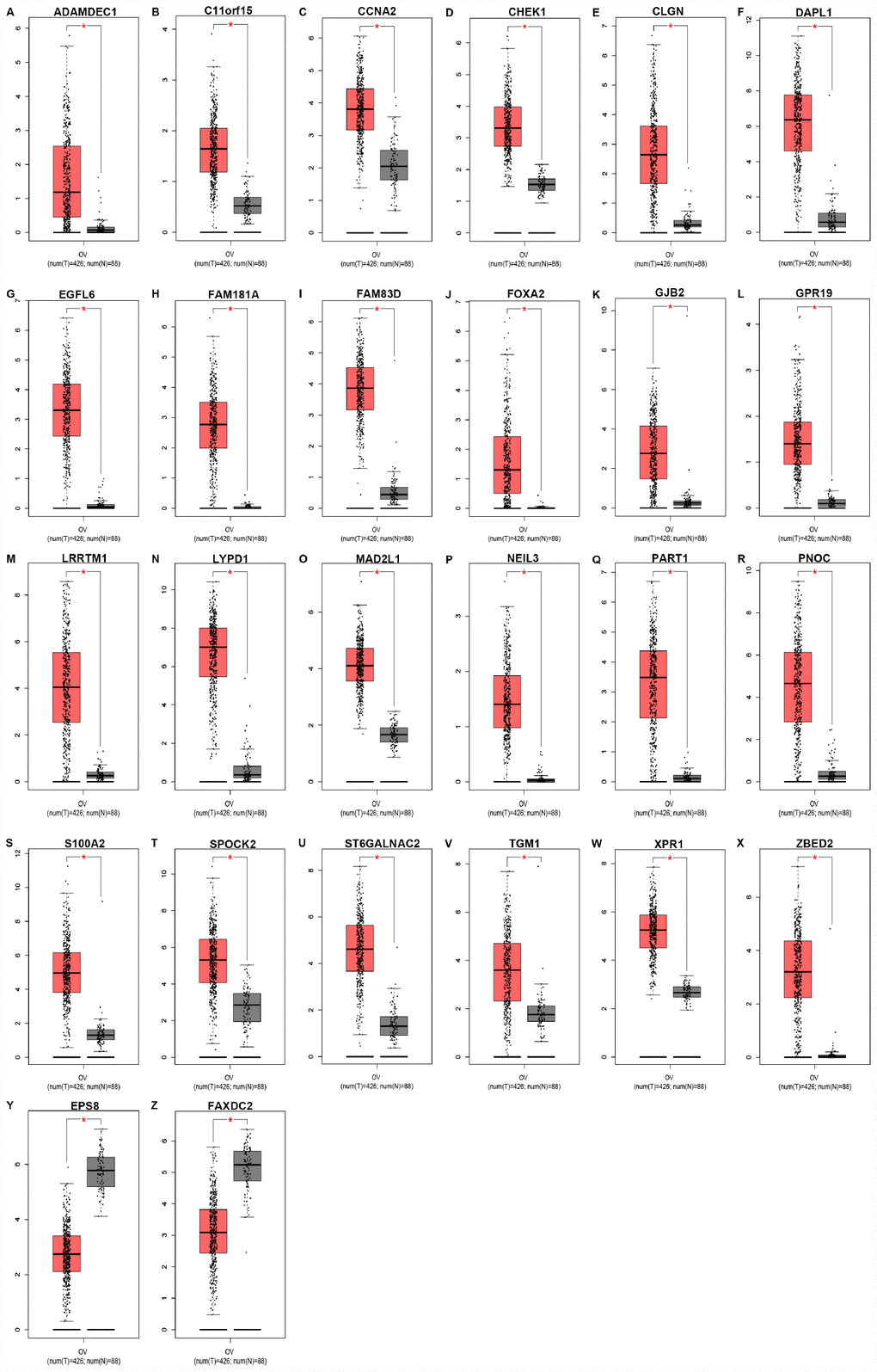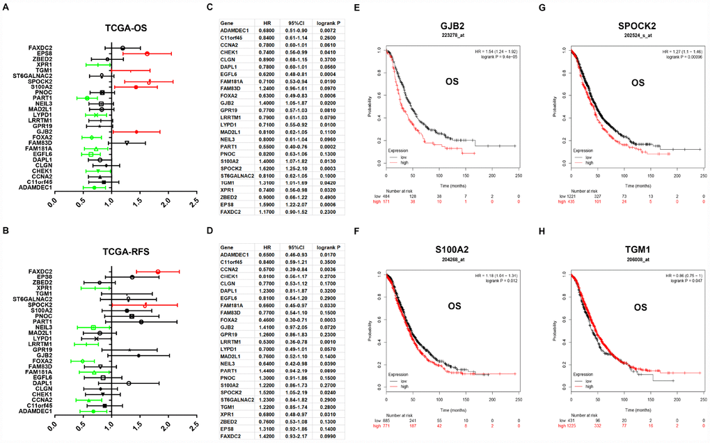 Next, for improving accuracy of analysis, TCGA ovarian cancer samples and GTEx normal data were introduced to validate expression levels of 37 candidate genes via GEPIA database. As shown in Figure 3, among the 37 candidate genes, expression of 26 genes (ADAMDEC1, C11orf15, CCNA2, CHEK1, CLGN, DAPL1, EGFL6, FAM181A, FAM83D, FOXA2, GJB2, GPR19, LRRTM1, LYPD1, MAD2L1, NEIL3, PART1, PNOC, S100A2, SPOCK2, ST6GALNAC2, TGM1, XPR1, ZBED2, EPS8 and FAXDC2) were in accordance with the results acquired from GSE12470. Notably, only two genes (EPS8 and FAXDC2) were downregulated in cancer tissues compared with normal controls. In the following survival analysis, we focused on the 26 candidate genes. Firstly, TCGA ovarian cancer cohort was introduced to assess the prognostic values (including OS and RFS) of the 26 candidate genes. As shown in Figure 4A, high expression of GJB2, S100A2, SPOCK2, TGM1or EPS8 indicated a poor OS of patients with ovarian cancer, whereas ovarian cancer patients with higher expression of ADAMDEC1, CHEK1, EGFL6, FAM181A, FOXA2, LYPD1, PART1 or XPR1 possessed better OS. For RFS of patients with ovarian cancer, SPOCK2 and FAXDC2 were unfavorable prognostic biomarkers but ADAMDEC1, CCNA2, FAM181A, FOXA2, LRRTM1, NEIL3 and XPR1 were favorable prognostic biomarkers (Figure 4B). Among these genes, only expression levels of GJB2, S100A2, SPOCK2 and TGM1 were significantly upregulated in cancer samples and their high expression indicated poor prognosis (OS or RFS). The detailed information of survival analysis was listed in Figure 4C and Figure 4D. Subsequently, we introduced the ovarian cancer data other than TCGA to further assess the survival effects of GJB2, S100A2, SPOCK2 and TGM1 on prognosis (OS) by Kaplan-Meier plotter. As presented in Figure 4E–4G, ovarian cancer patients with higher expression of GJB2, S100A2 and SPOCK2 showed better OS, which was identical with the analytic results obtained from TCGA cohort. However, in 206008_at cohort, increased expression of TGM1 linked to favorable OS of ovarian cancer (Figure 4H), contrary to TCGA cohort. Taken together, GJB2, S100A2 and SPOCK2 might be three key genes in mediating tumor stage progression of ovarian cancer and causing poor prognosis.